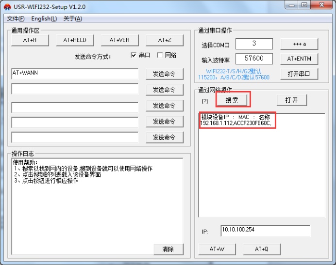 1.通過網(wǎng)絡(luò)搜索。局域網(wǎng)內(nèi)電腦,打開USR-WIFI232-Setup軟件(直接點擊軟件名稱可以進入下載鏈接),點擊搜索,即可看到模塊的IP。