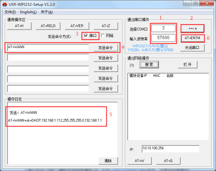 2.通過串口讀取。模塊串口連接電腦,打開USR-WIFI232-Setup軟件(直接點擊軟件名稱可以進入下載鏈接),選擇COM口和波特率,發(fā)送+++ a(成功會返回+ok,沒有返回的話請檢查硬件連接及串口線),發(fā)送命令方式選擇串口,發(fā)送AT+WANN查詢,查詢結(jié)束后要點擊AT+ENTM返回通訊。