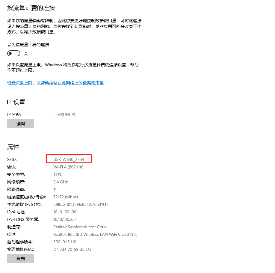 USR-W630默認(rèn)是AP模式,電腦連接USR-W630的wifi。