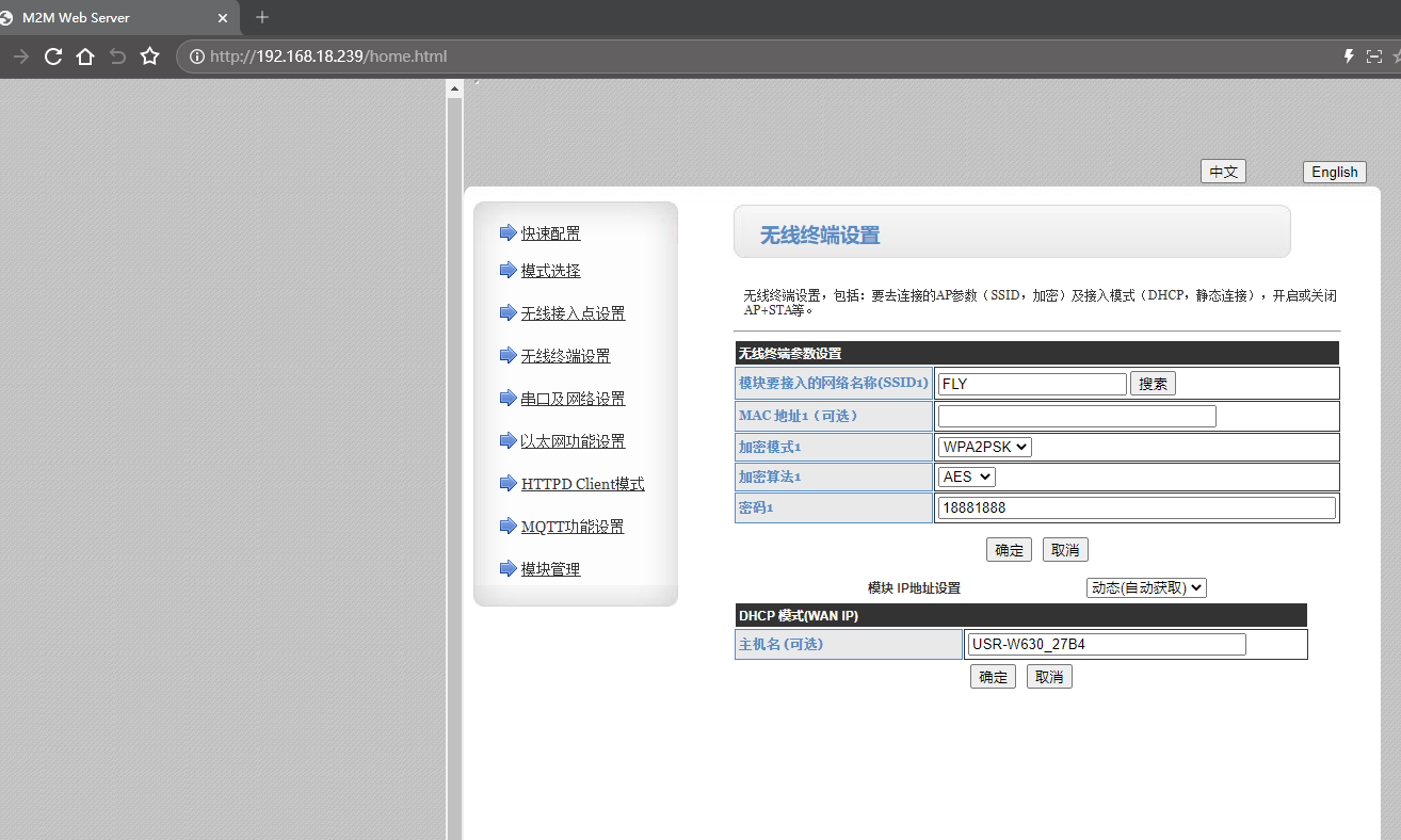 網(wǎng)頁上設(shè)置STA模式,開啟透明傳輸模式,點擊確定。不要重啟模塊,等所有參數(shù)都配置完了,再重啟W630。