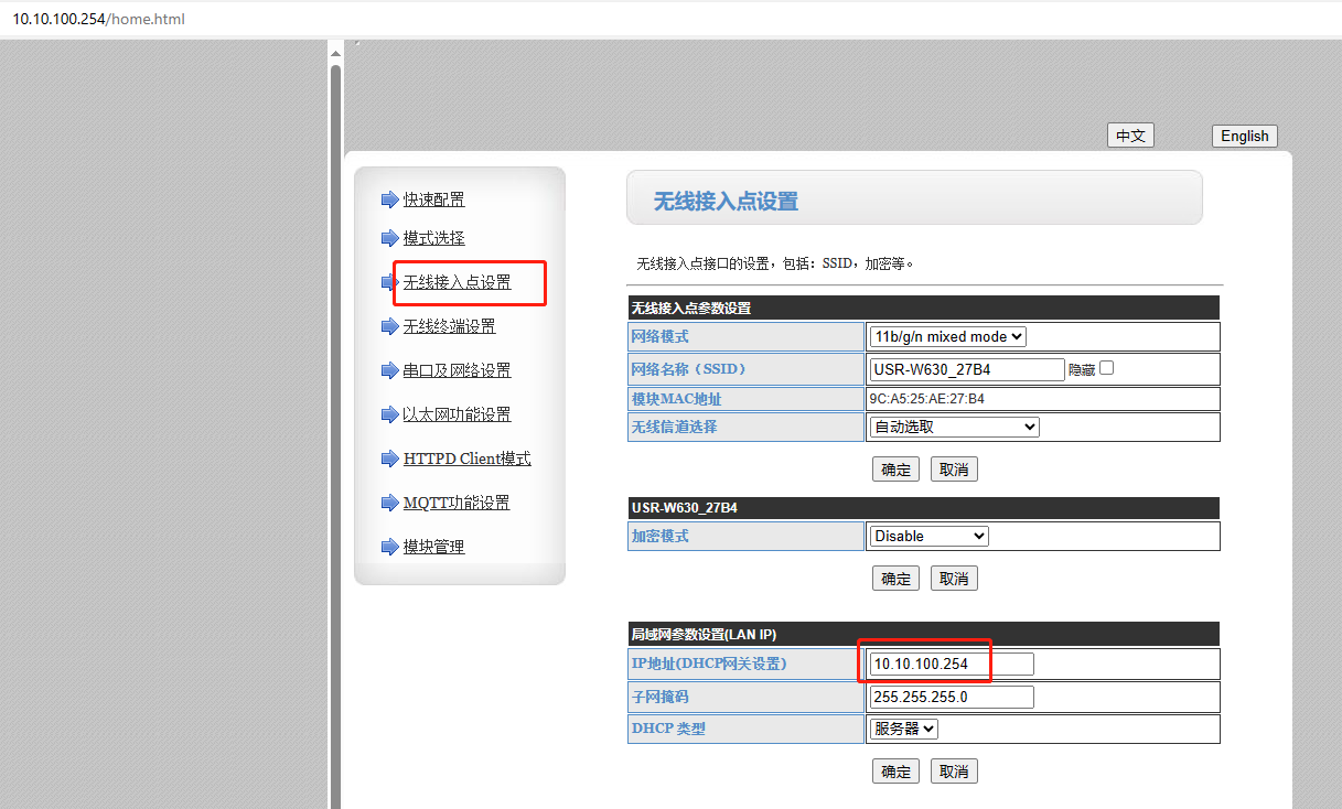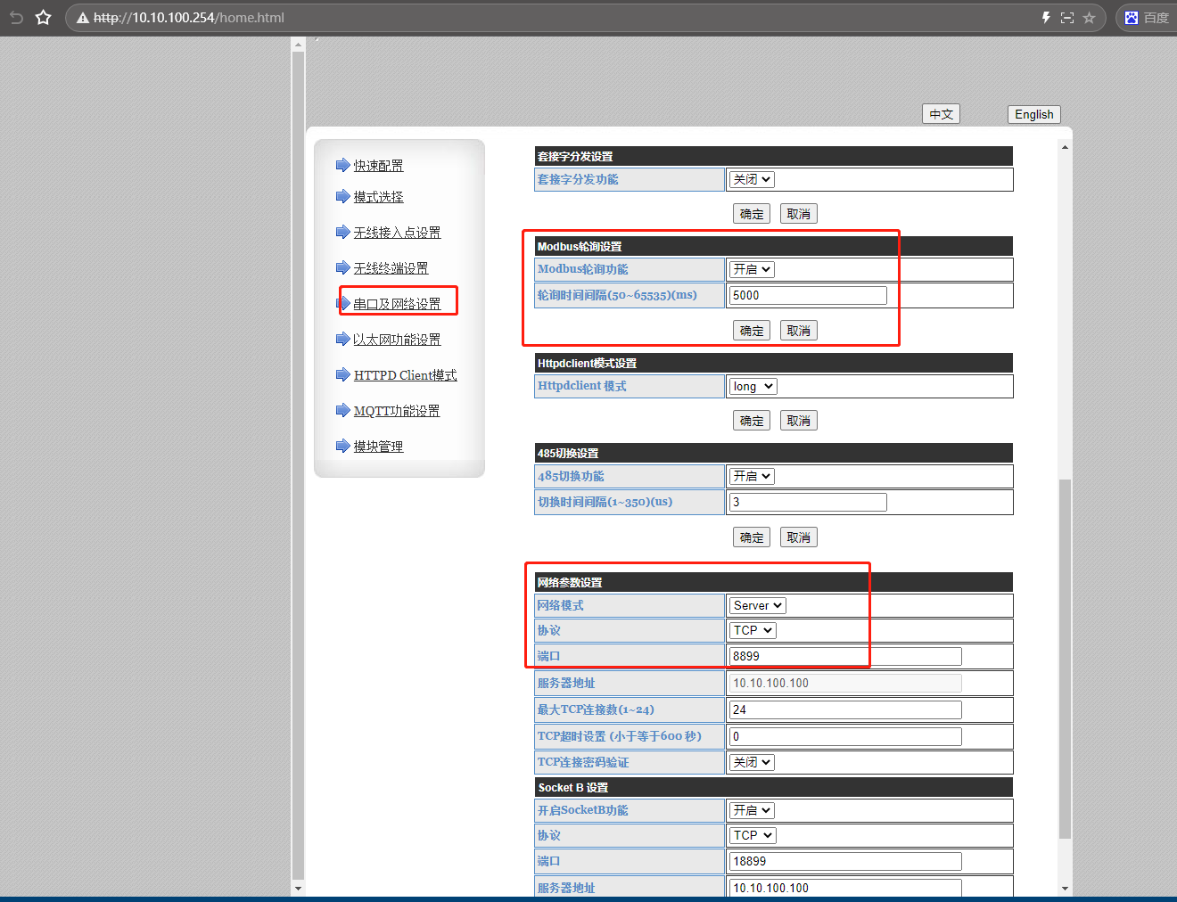 網(wǎng)頁上設(shè)置AP模式,開啟MODBUS TCP轉(zhuǎn)MODBUS RTU模式,點擊確定。