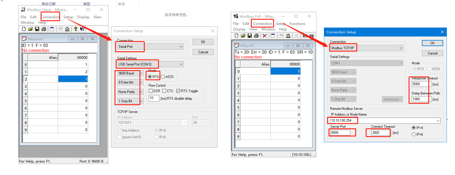 打開MODBUS POLL軟件,設(shè)置MODBUS TCP,IP填W630的IP 10.10.100.254,服務(wù)器的端口填8899。配置好3個時間參數(shù)。