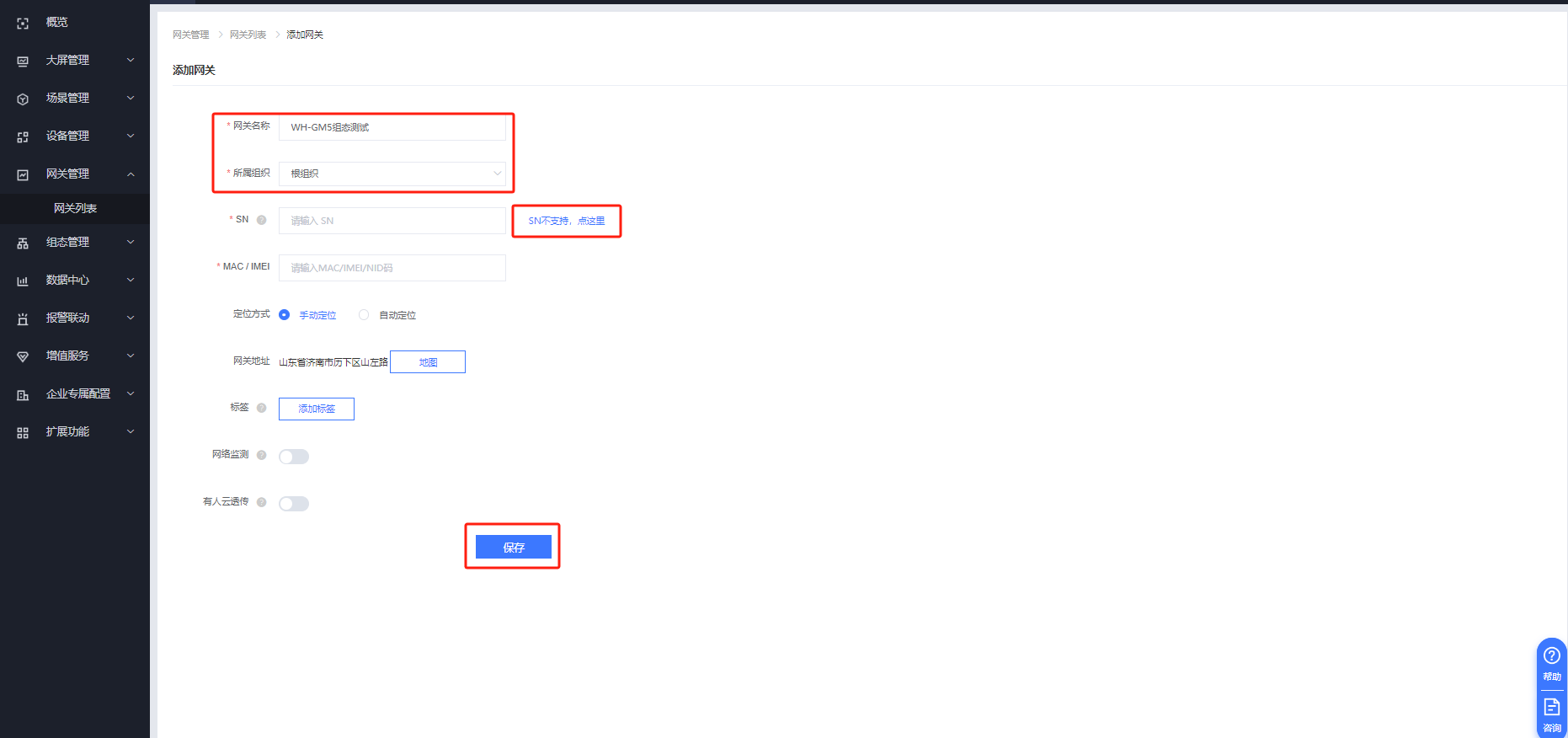 填入網(wǎng)關(guān)名稱,選擇組織,注意選擇“SN不支持,點(diǎn)這里”點(diǎn)擊保存即可