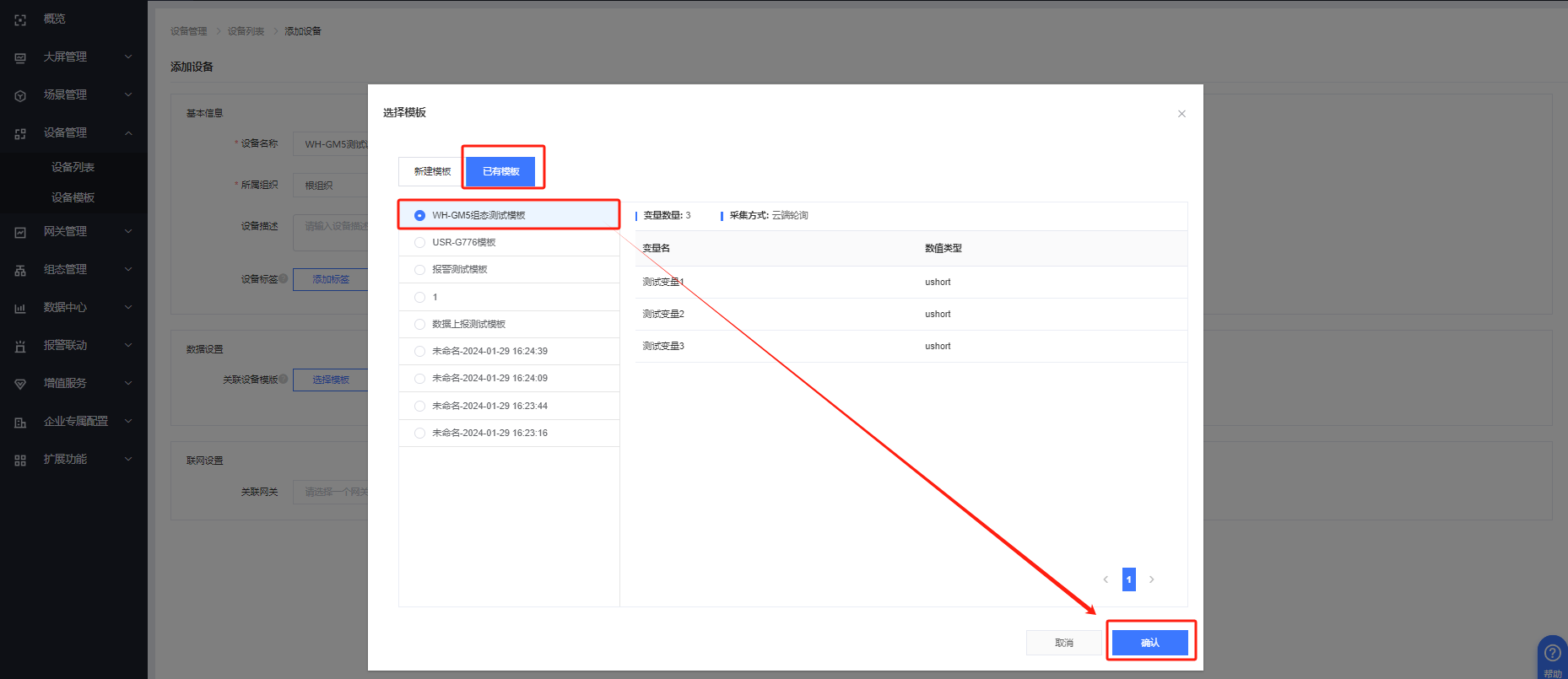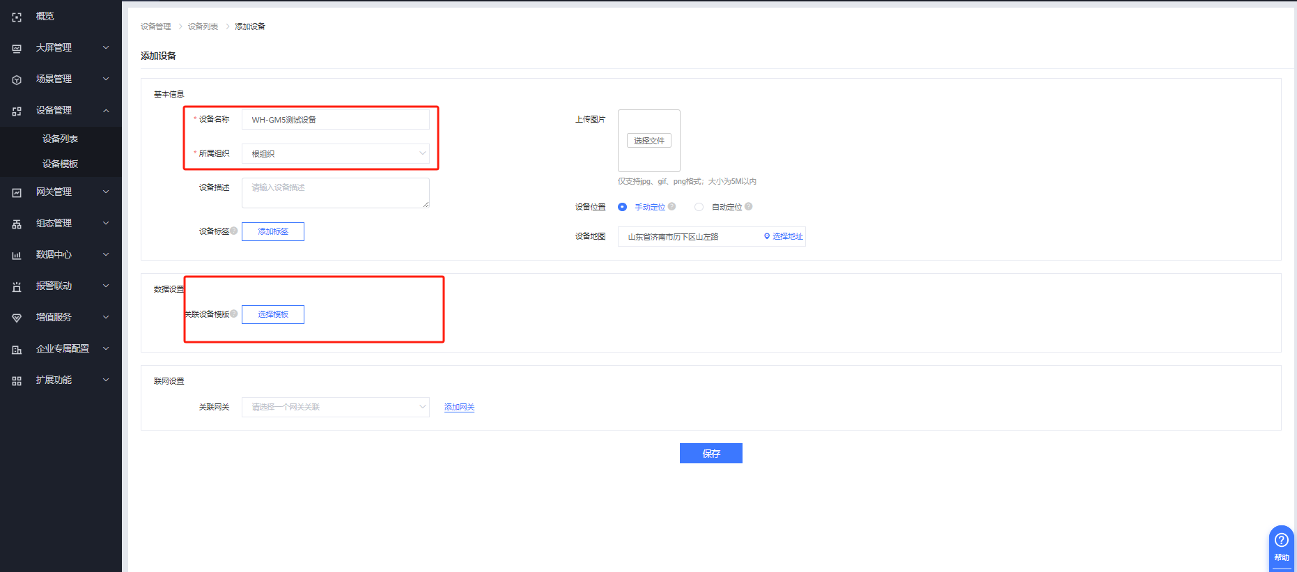 填入設(shè)備名稱、組織,綁定設(shè)備模板