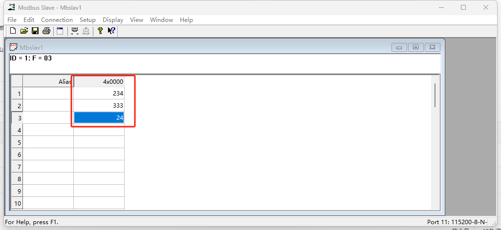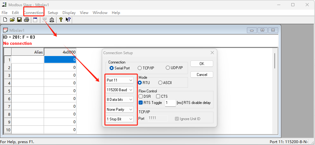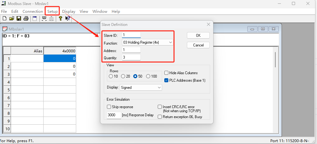 使用modbus slave軟件模擬從機(jī),調(diào)用COM11,串口參數(shù)選擇115200 N 8 1(和WH-GM5TF-CT-4-N40保持一致)