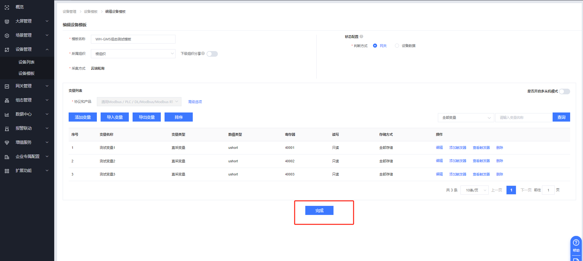 同樣方式添加測(cè)試變量2、測(cè)試變量3,點(diǎn)擊完成即可。