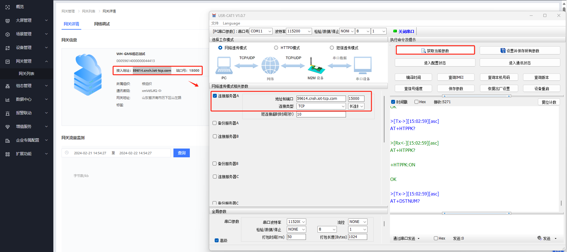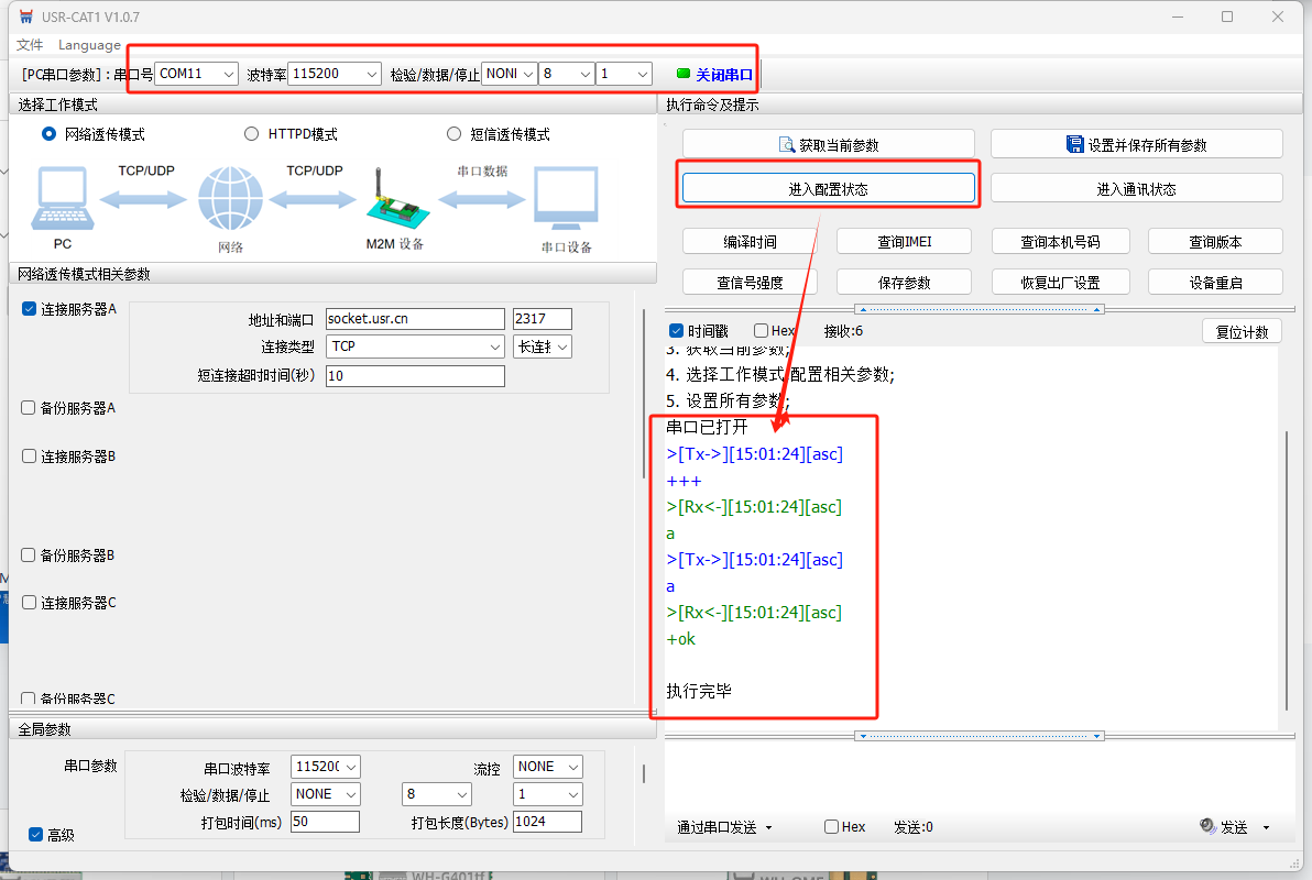 電腦打開(kāi)USR-CAT1V1.0.7軟件,串口參數(shù)選擇115200 N 8 1,COM口選擇COM11,打開(kāi)串口,點(diǎn)擊進(jìn)入配置狀態(tài)。