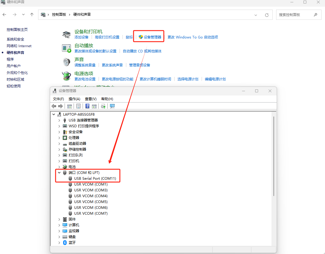 打開(kāi)控制面板---設(shè)備管理器確認(rèn)USB轉(zhuǎn)232轉(zhuǎn)換器COM口為COM11