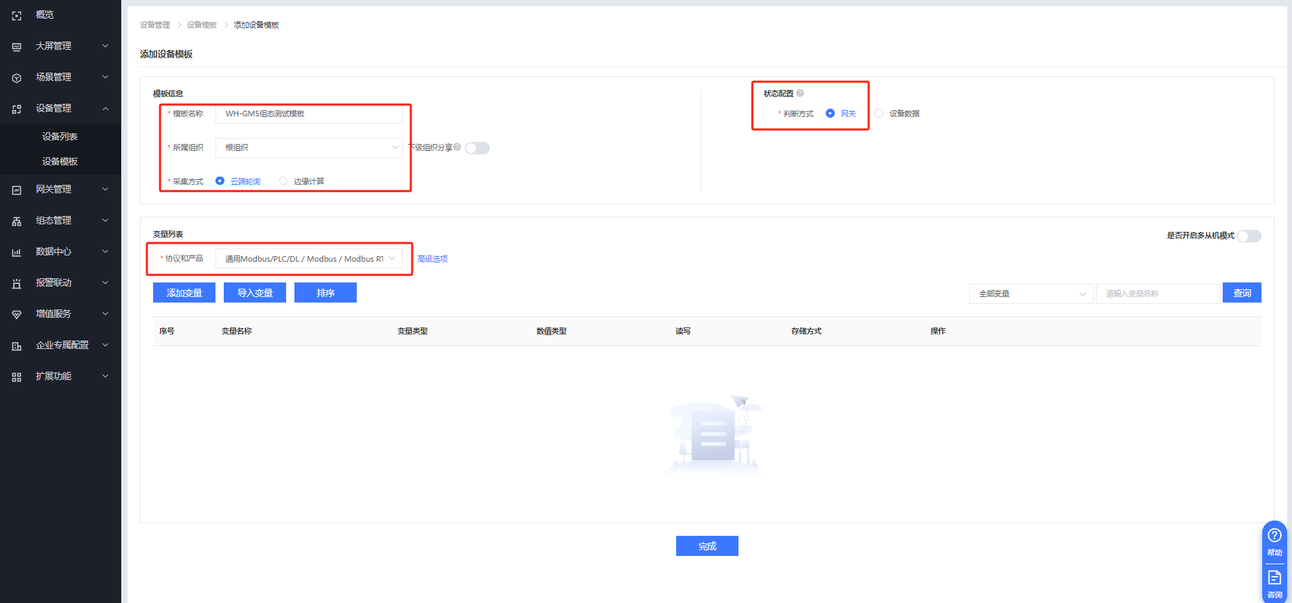 填入名稱、組織,采集方式選擇云端輪詢,協(xié)議選擇通用Modbus/PLC/DL / Modbus / Modbus RTU