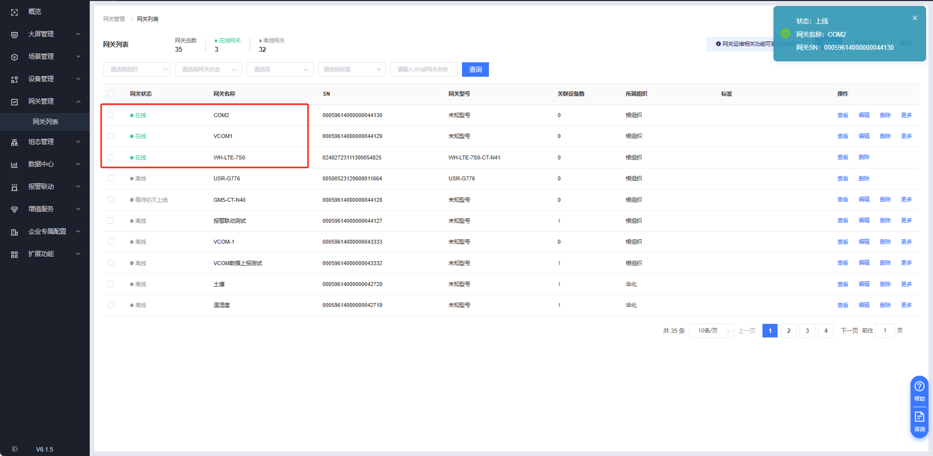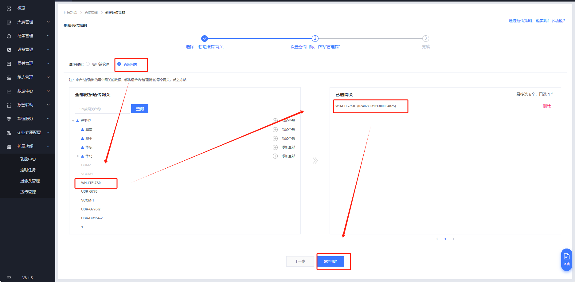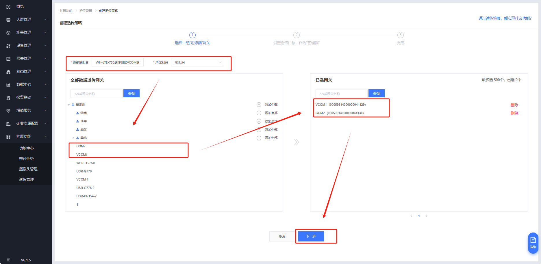 邊緣端命名WH-LTE-7S0透傳測試VCOM端,選擇根組織,選中兩個(gè)VCOM,下一步