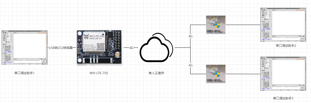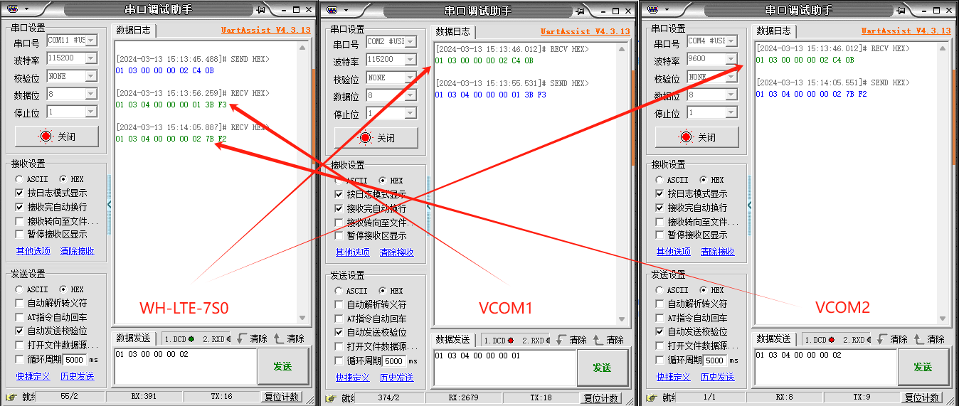 打開三個(gè)串口調(diào)試助手軟件,分別引用兩個(gè)虛擬和串口和WH-LTE-7S0的串口,發(fā)送數(shù)據(jù)進(jìn)行一對多透傳測試