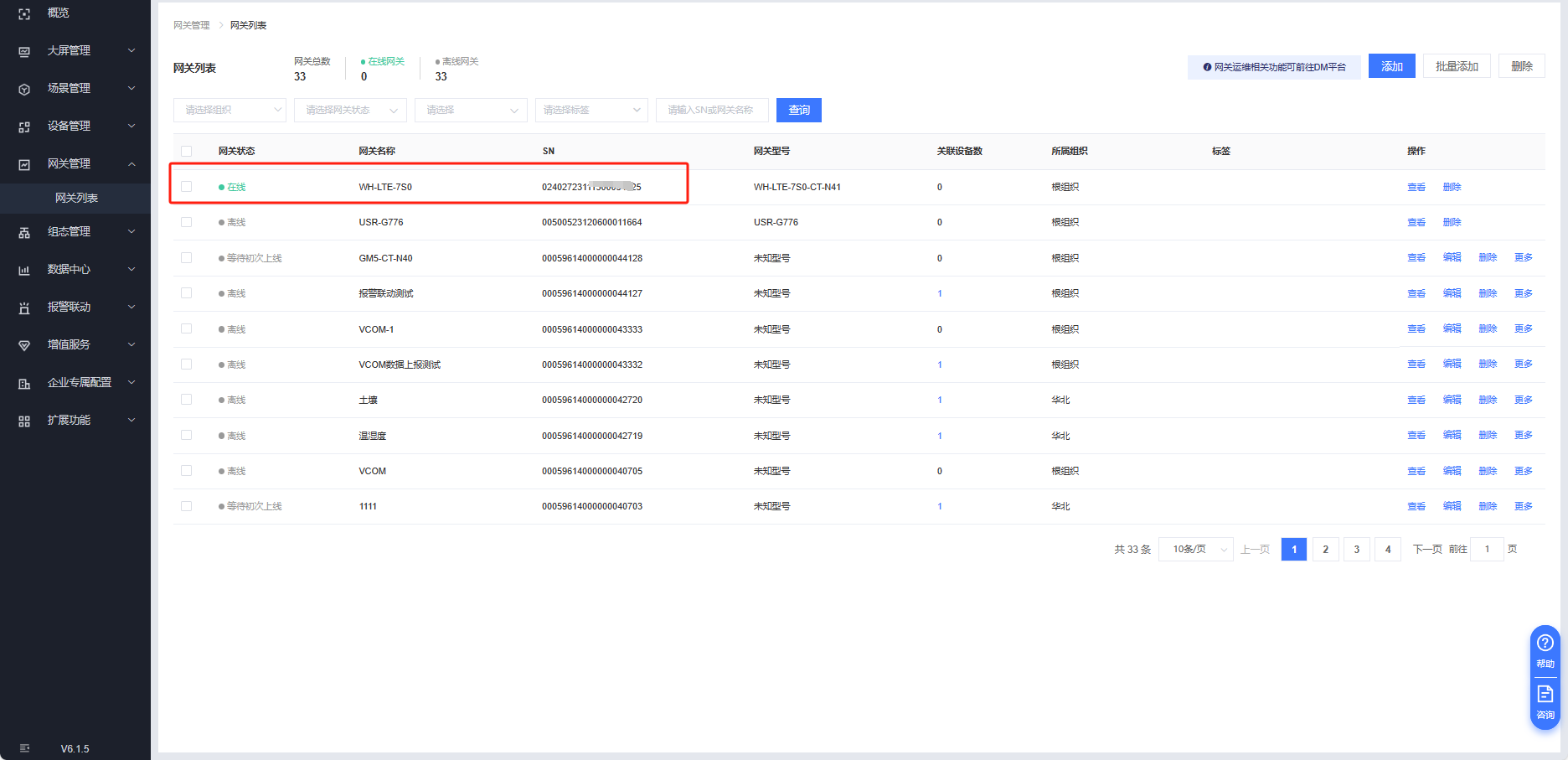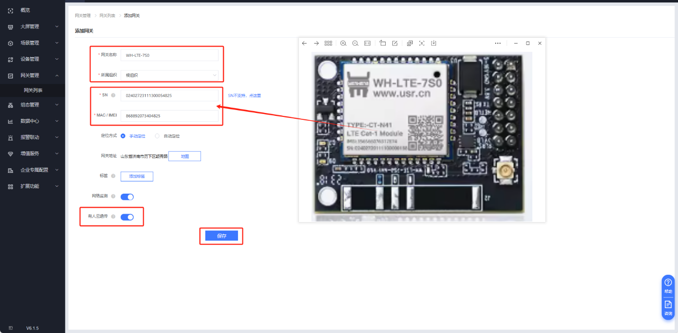 管理端選擇真實(shí)網(wǎng)關(guān),選則WH-LTE-7S0保存