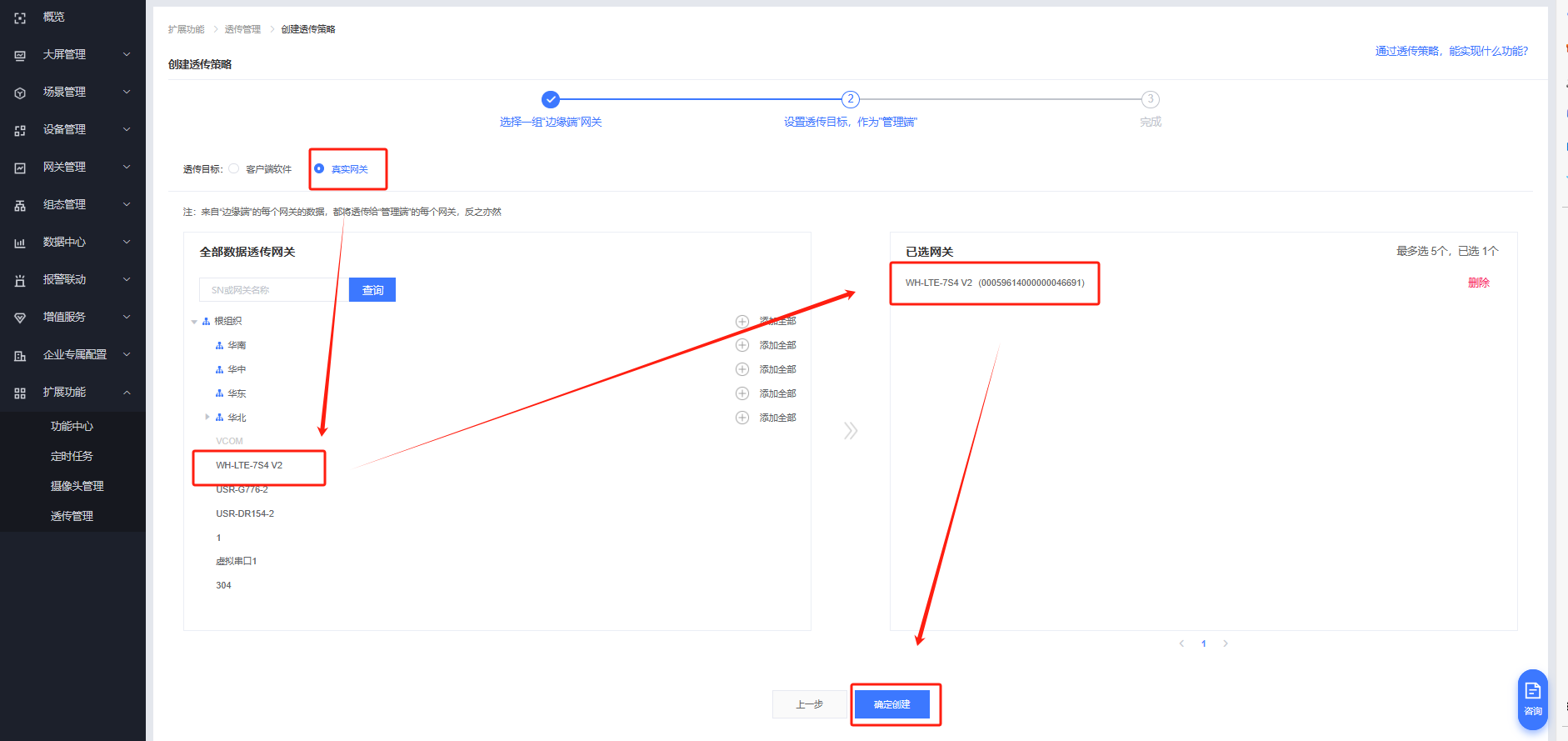 真實網(wǎng)關(guān),選擇WH-LTE-7S4 V2,點擊確定創(chuàng)建。