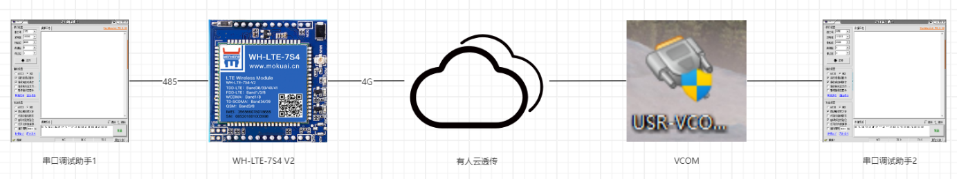 WH-LTE-7S4 V2插入SIM卡,然后模組插入到底板USR-7X-EVK上, EVK的485串口接USB-RS485串口線到電腦USB口,然后EVK接12V電源適配器上電。
