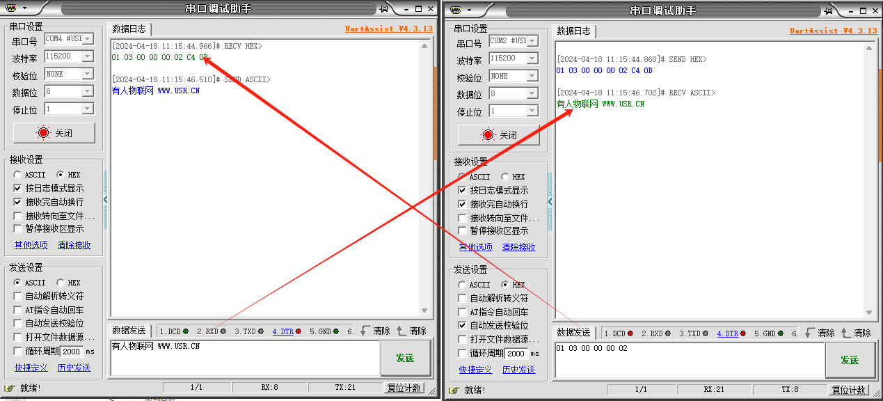 打開兩個串口調(diào)試助手,分別引用虛擬串口和轉(zhuǎn)換器的COM口,進行數(shù)據(jù)交互測試