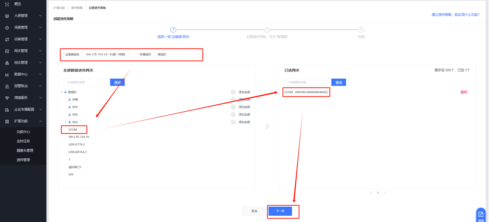 命名WH-LTE-7S4 V2一對透一傳測試,所屬組織根組織,選擇VCOM,下一步。