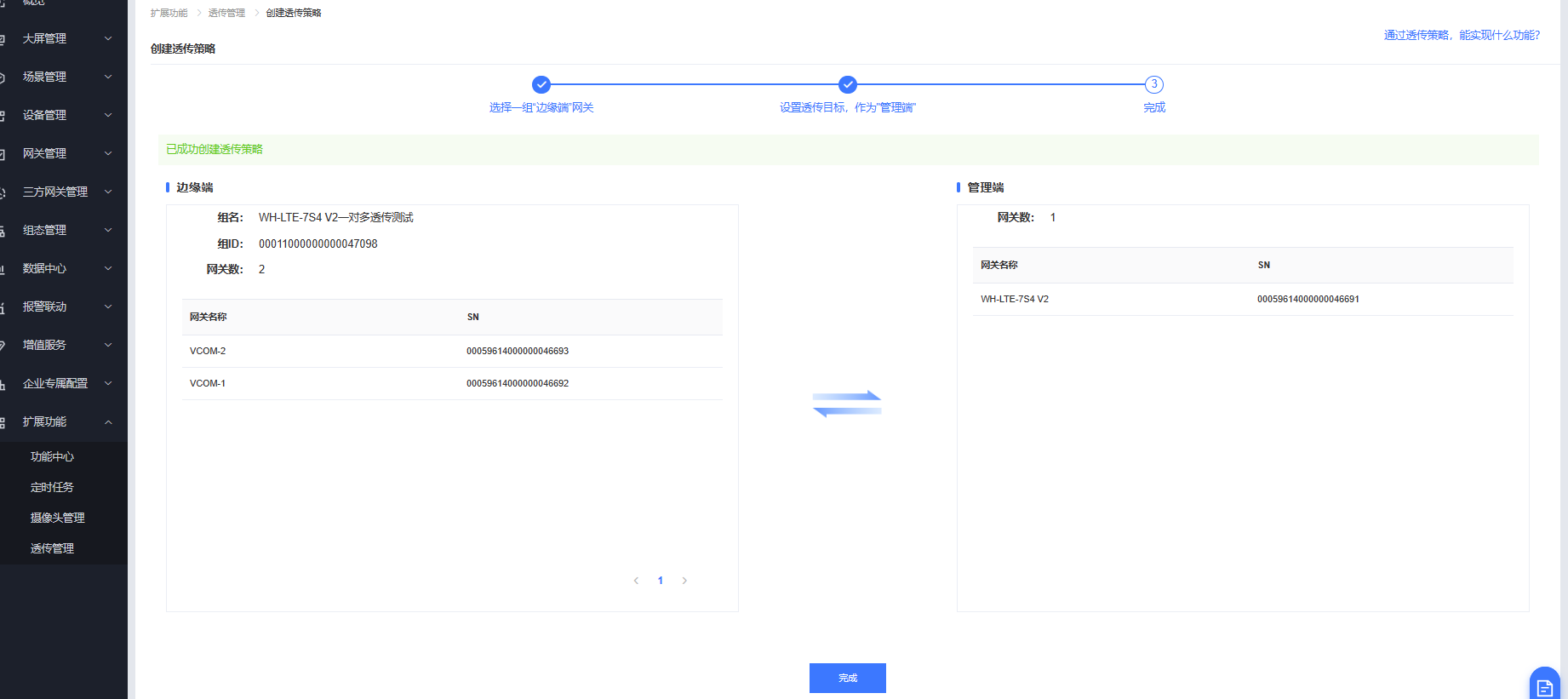 命名WH-LTE-7S4 V2一對多透傳測試,所屬組織根組織,選擇VCOM-1和VCOM-2,下一步。