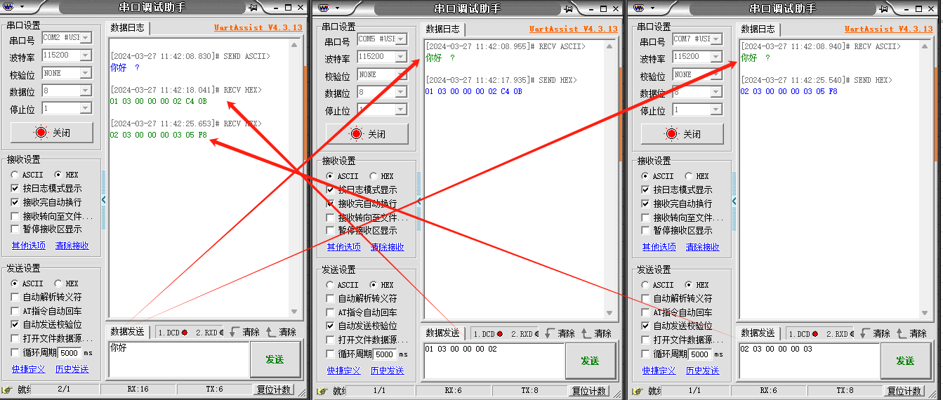 打開三個串口調試助手,分別引用兩個虛擬串口和轉換器的COM口,進行數(shù)據(jù)交互測試。