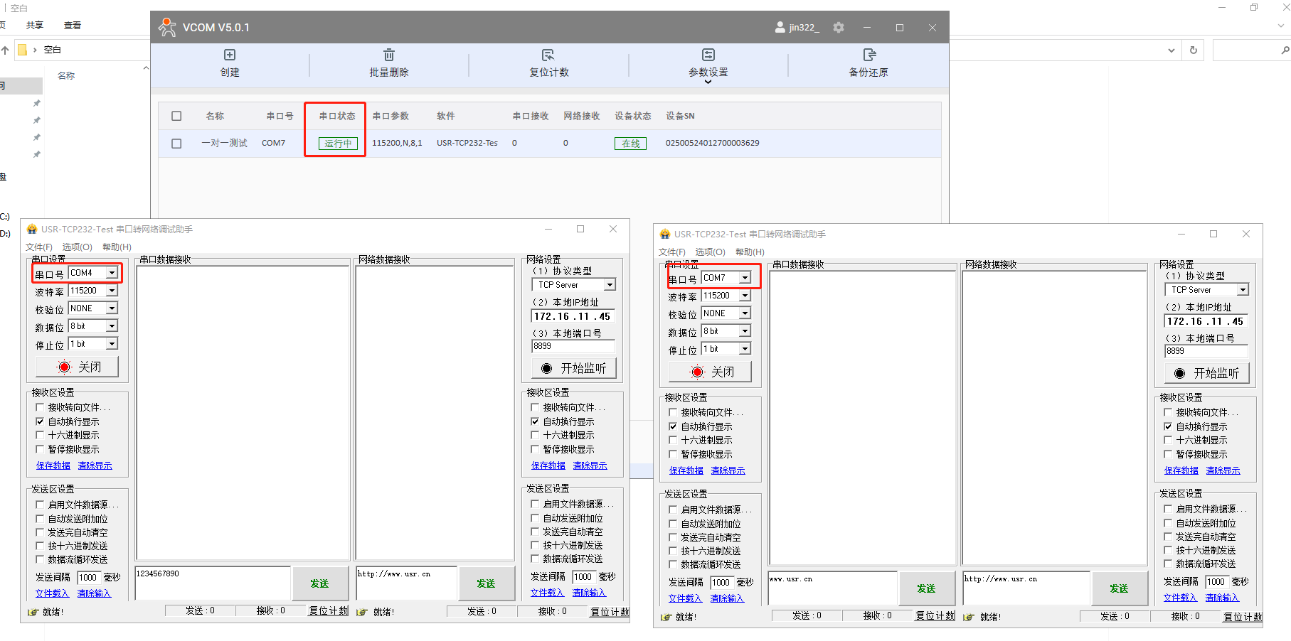 1、打開2個(gè)串口助手,分別用USR-G780s實(shí)際USB串口COM4打開串口,另一個(gè)串口助手用虛擬串口COM7打開串口。