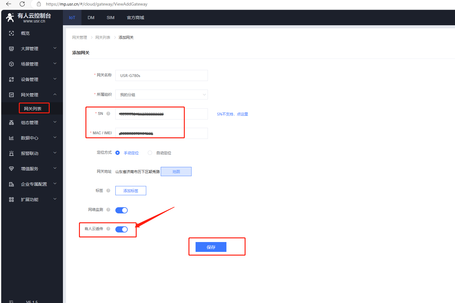 (2)USR-G780s查看產(chǎn)品反面標(biāo)簽,使用SN和IMEI在有人云上添加設(shè)備,和虛擬串口一對(duì)一通訊,有人云透傳需要勾選開啟,最后點(diǎn)擊保存。