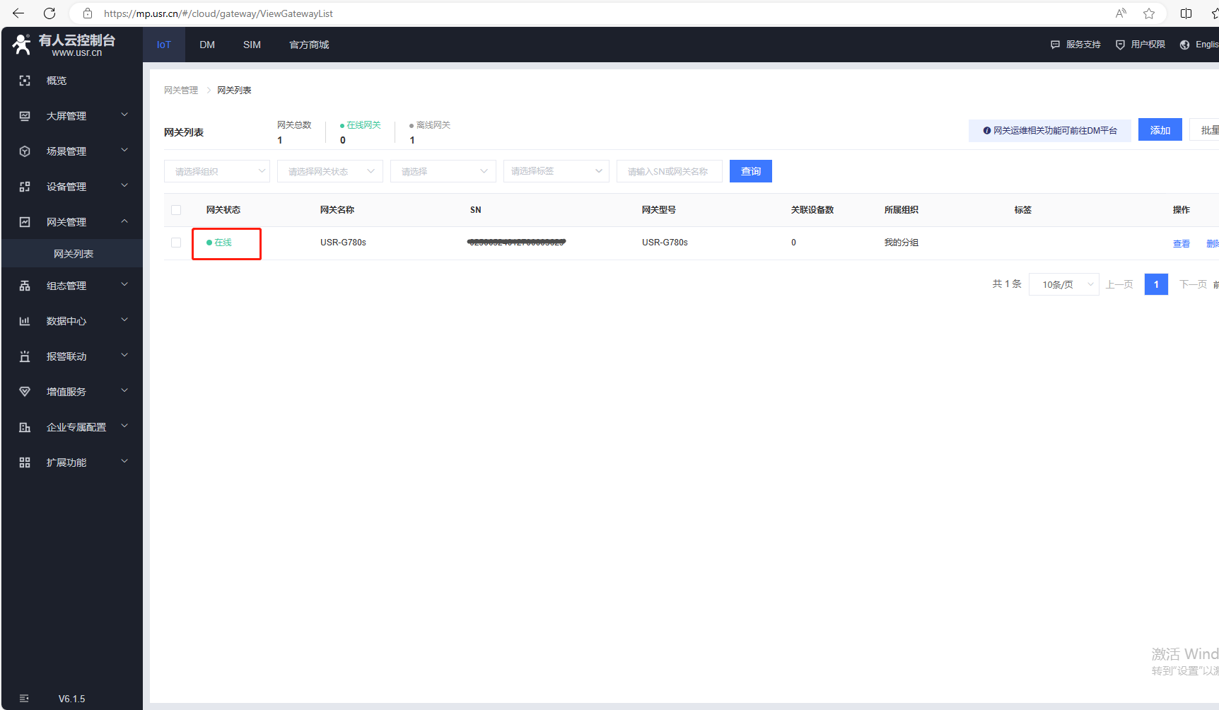 (3)添加完成,返回網(wǎng)關(guān)列表,含有人公司內(nèi)置SIM卡,聯(lián)網(wǎng)正常后,網(wǎng)絡(luò)狀態(tài)在線。也可以單獨(dú)插外置卡(可以上網(wǎng)的物聯(lián)卡、手機(jī)卡)