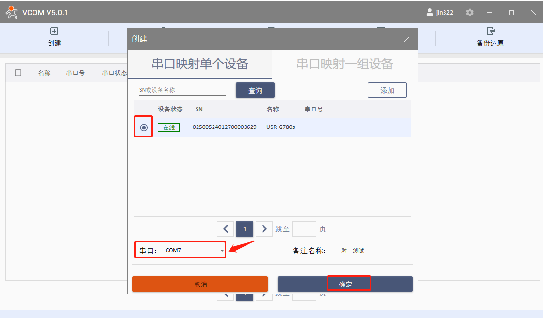 選擇串口映射單個(gè)設(shè)備,勾選在線的USR-G780s,用空閑的COM7作為虛擬串口的COM口號(hào),點(diǎn)擊確定。