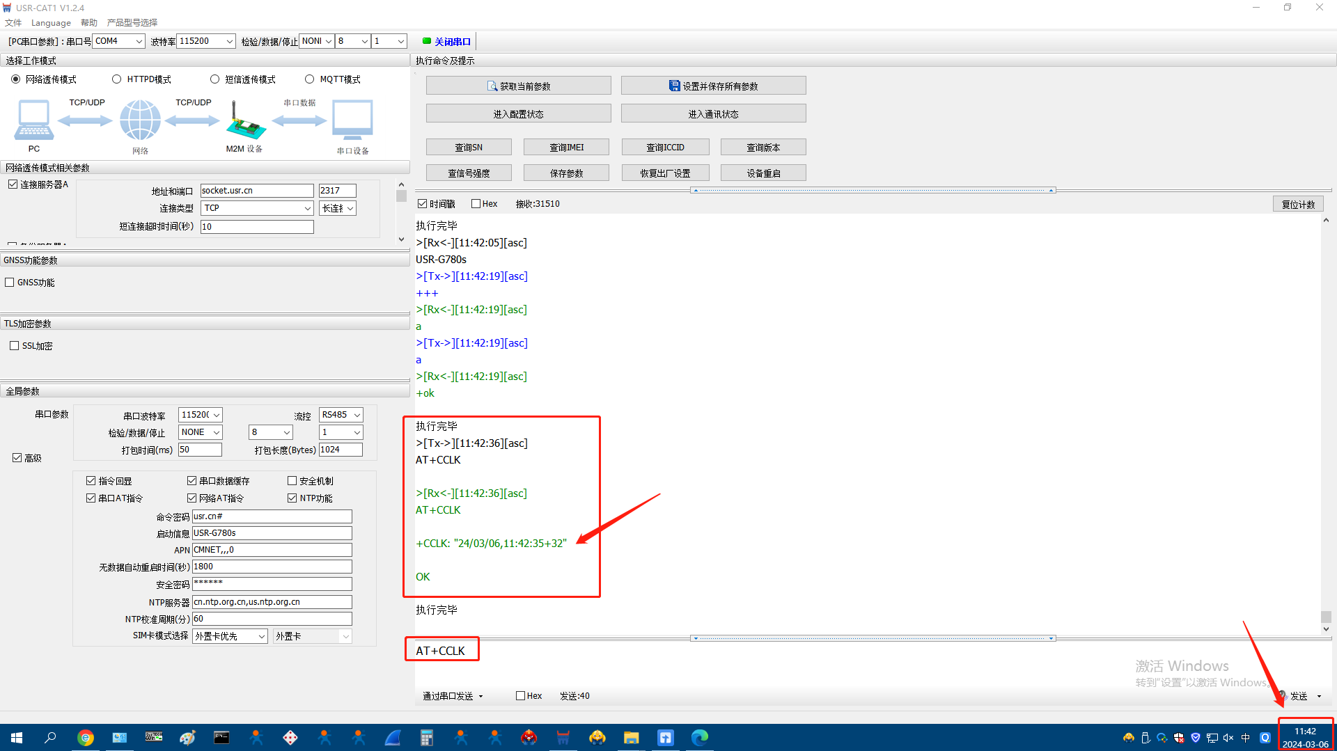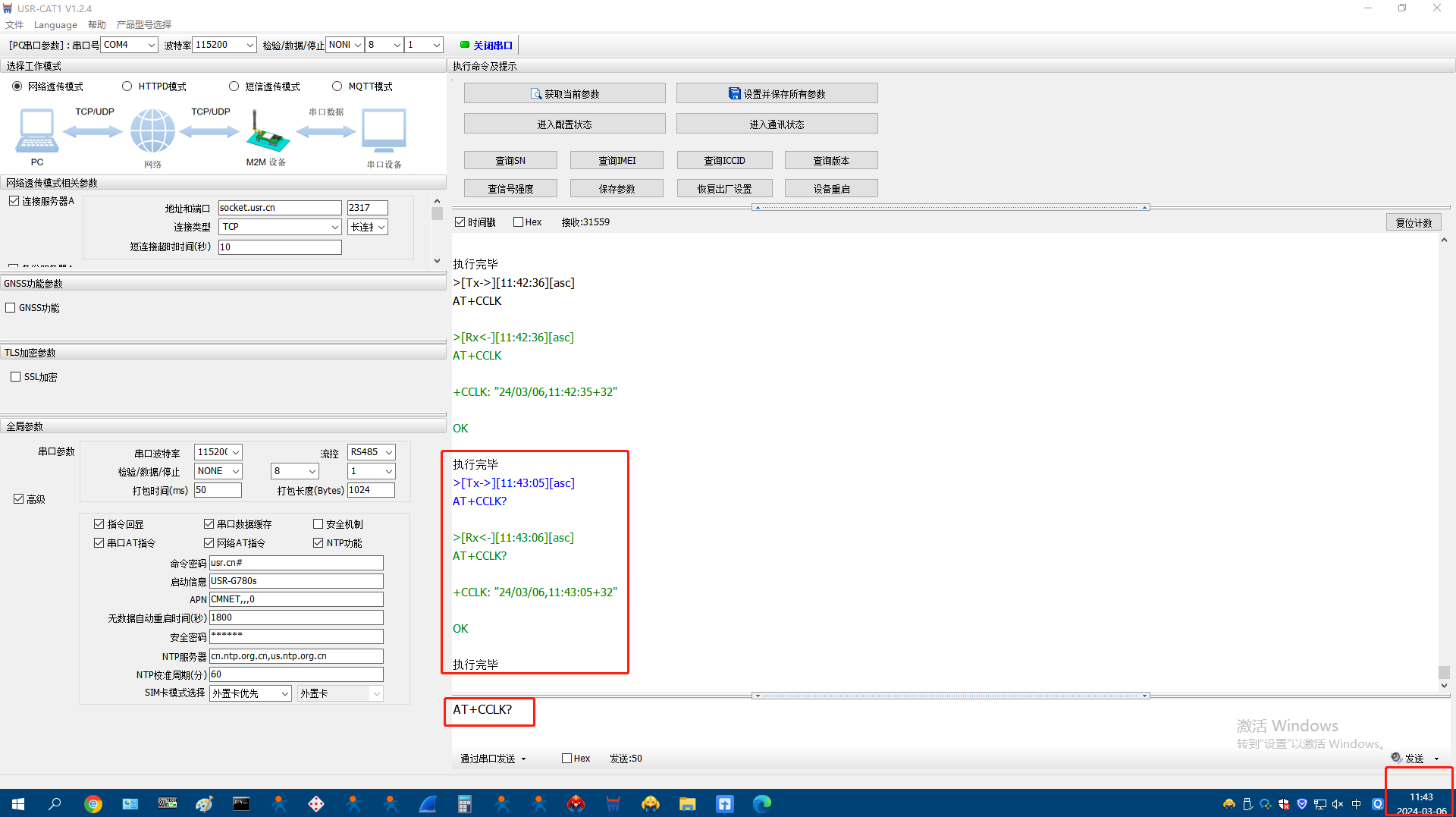 輸入框輸入AT+CCLK? 英文格式的問(wèn)號(hào),點(diǎn)擊發(fā)送,可以獲取當(dāng)前時(shí)間。