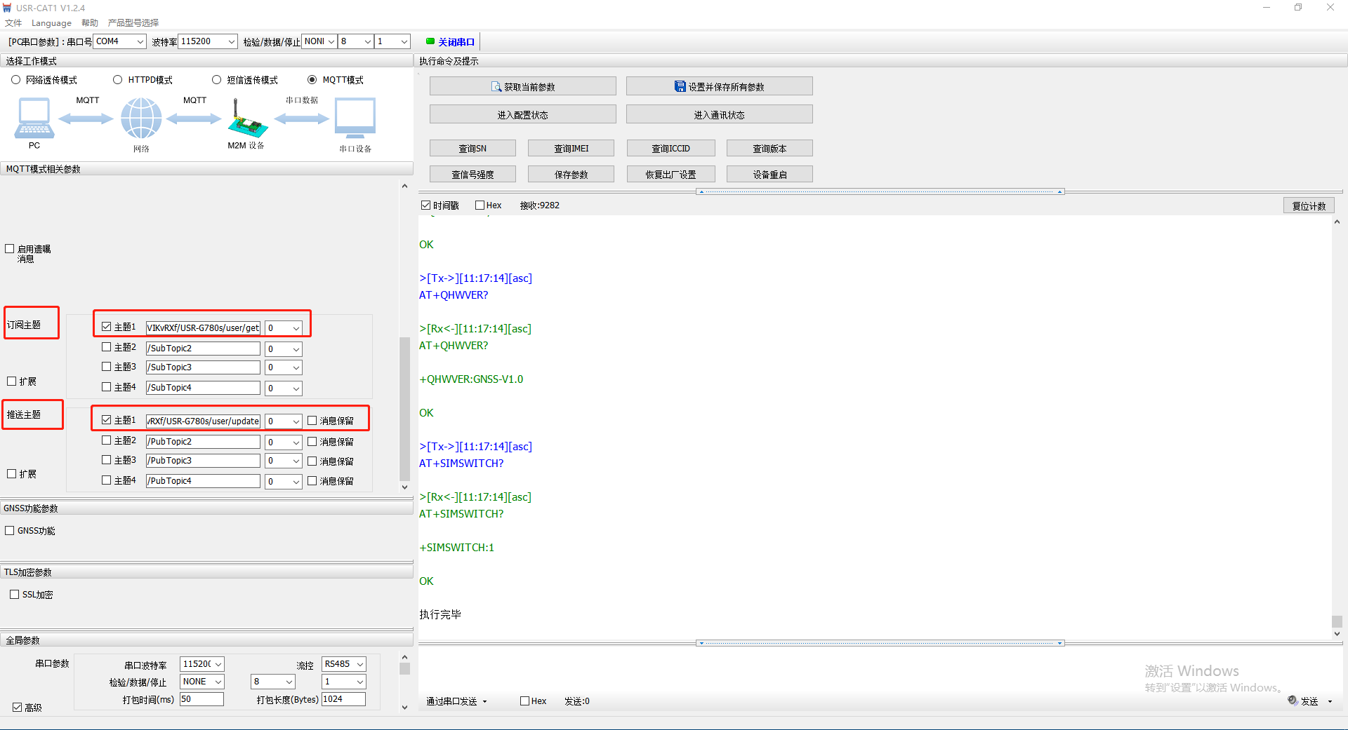 將發(fā)布的主題/i4u4VIKvRXf/USR-G780s/user/update填寫到USR-G780s推送主題配置中去;