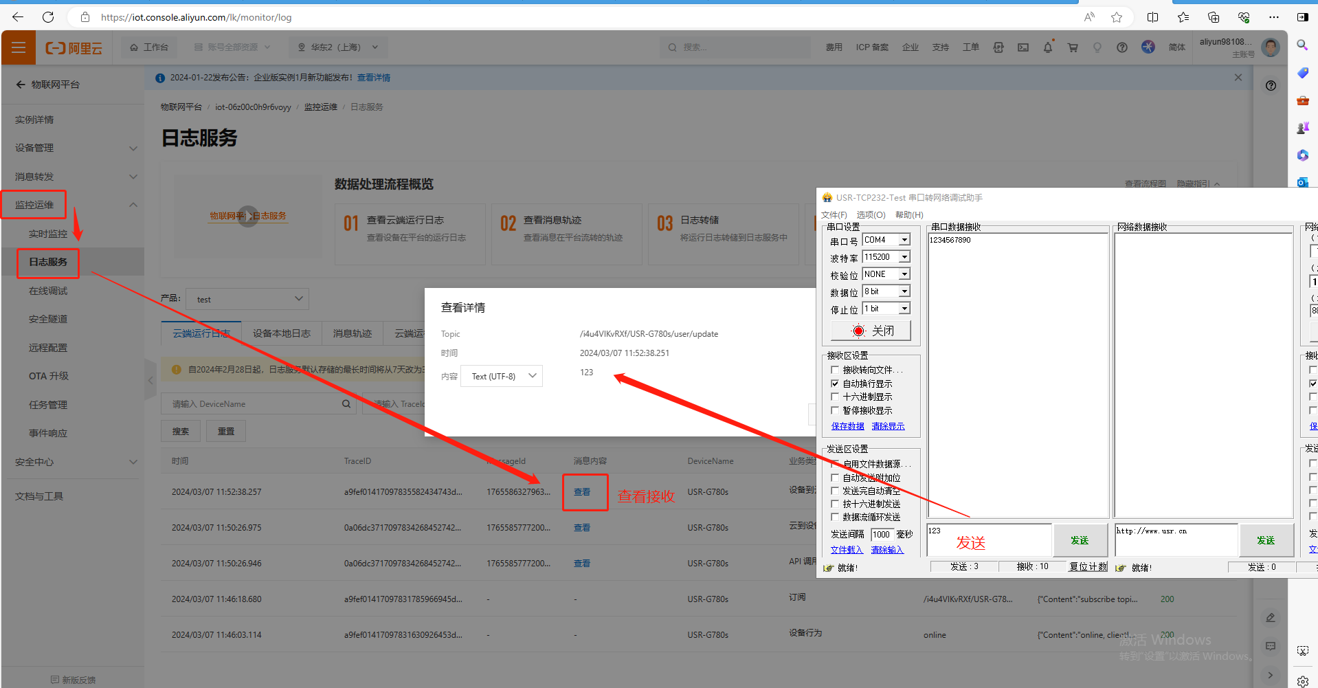 (2)USR-G780s使用串口助手發(fā)送數(shù)據(jù)123,發(fā)送完成之后,我們在阿里云平臺可以通過日志服務,點擊查看,看到USR-G780s串口發(fā)到阿里云的數(shù)據(jù)123。