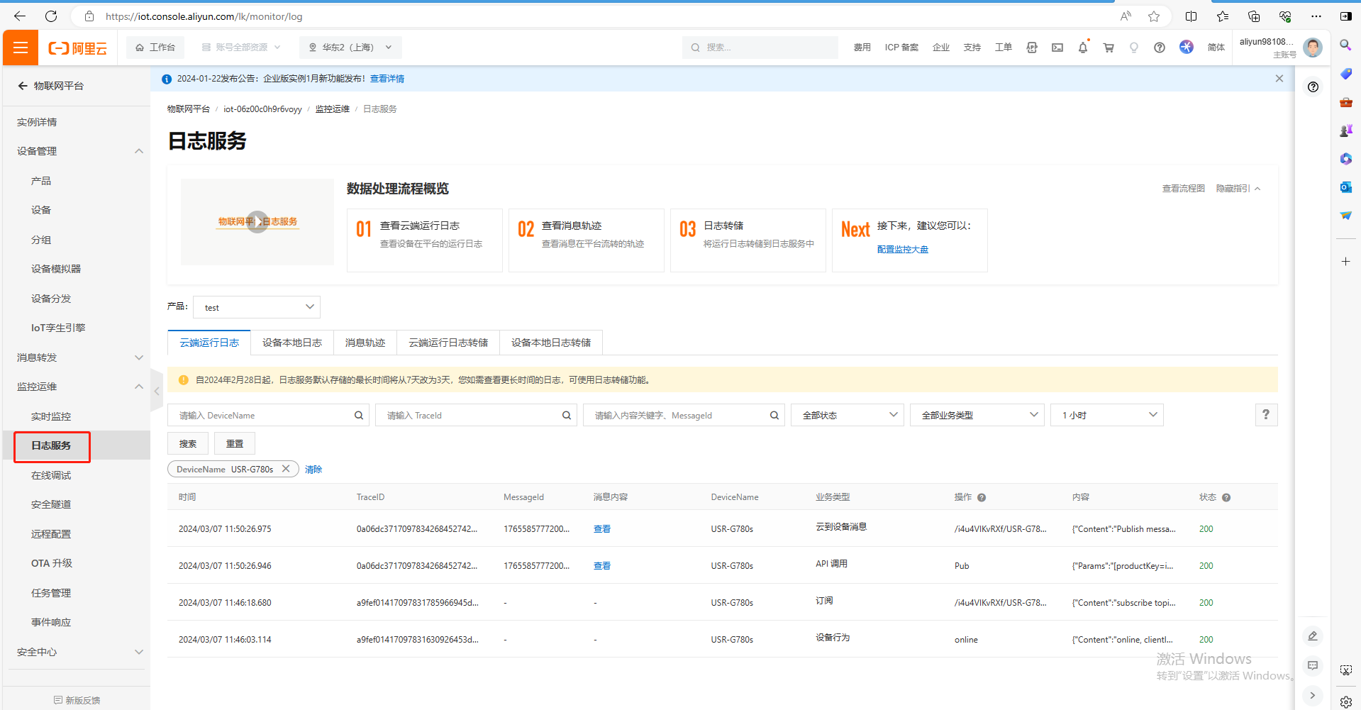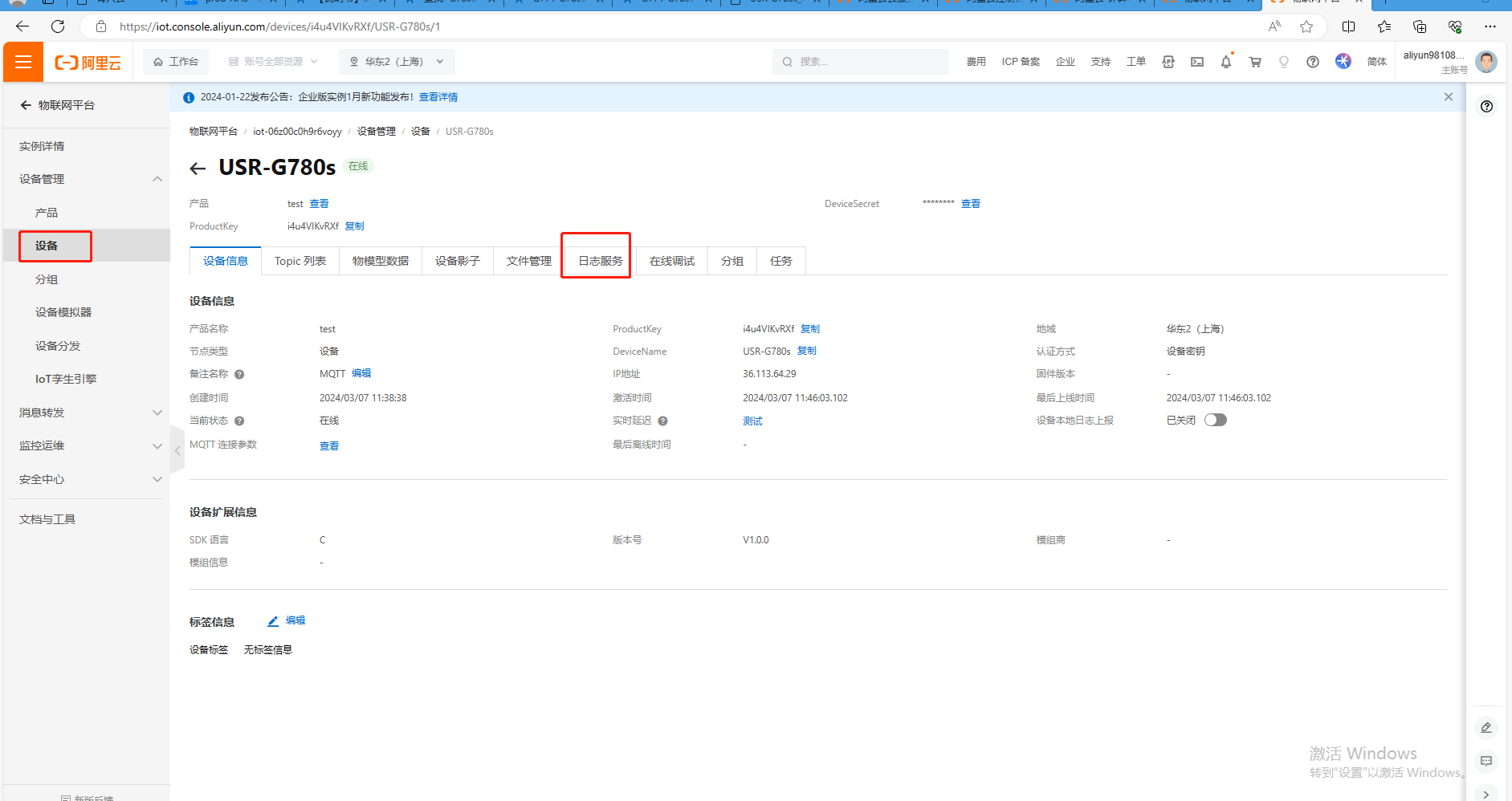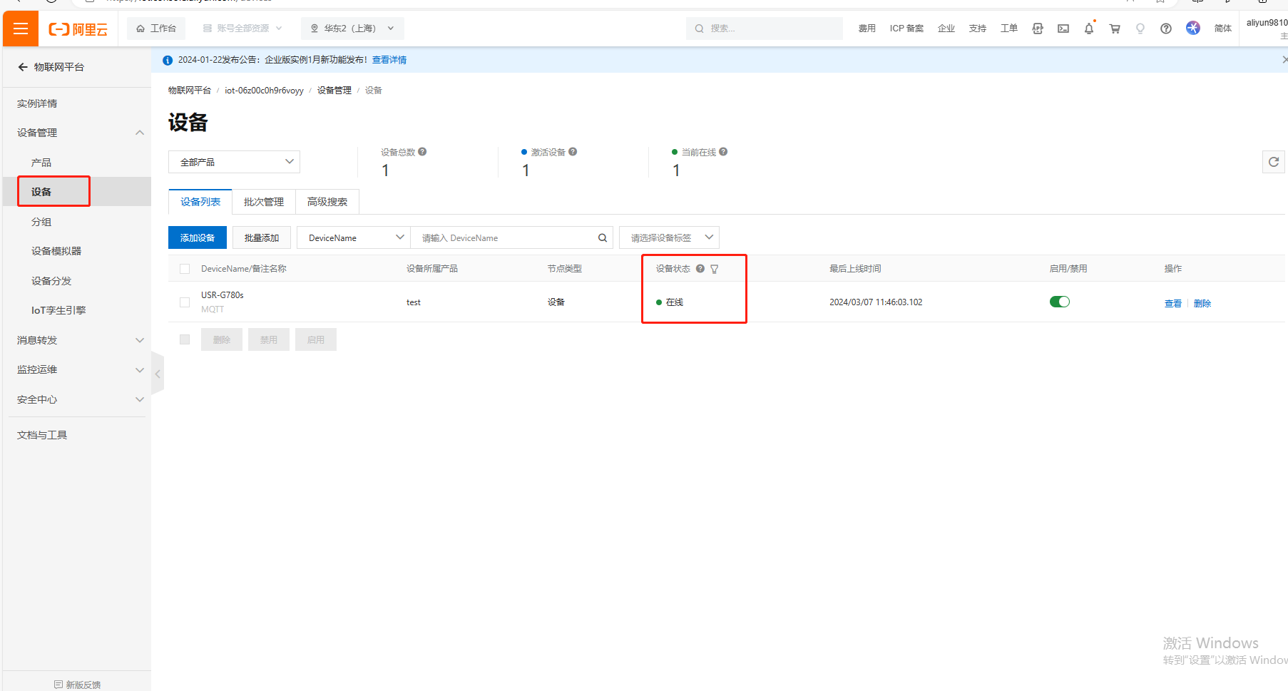 USR-G780s 設置完MQTT連接阿里云參數(shù),聯(lián)網(wǎng)正常,在阿里云平臺可以看到設備狀態(tài)是在線。