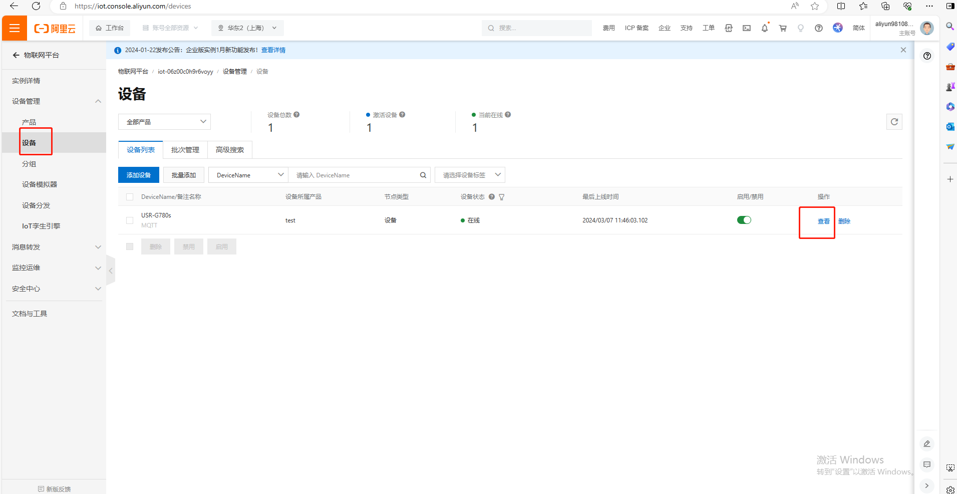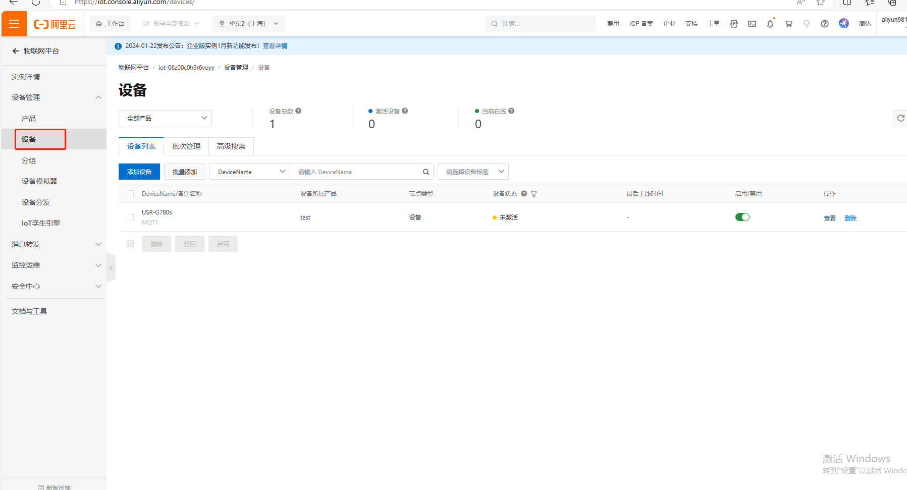 (2)添加完設備,如下圖展示,設備狀態(tài)是未激活,等設置完USR-G780s的MQTT連接阿里云參數(shù)之后,設備狀態(tài)才顯示在線。