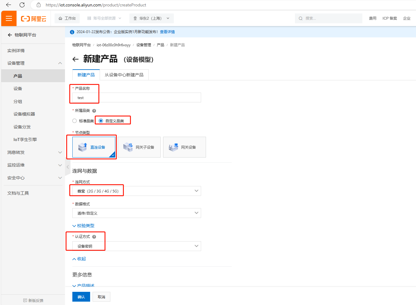 產(chǎn)品名稱舉例test——所屬品類選擇自定義品類——節(jié)點類型選擇直連設備——聯(lián)網(wǎng)與數(shù)據(jù)聯(lián)網(wǎng)方式選擇蜂窩(2G/3G/4G/5G)——數(shù)據(jù)格式選擇透傳/自定義——認證方式選擇設備秘鑰——點擊確定,完成創(chuàng)建產(chǎn)品。