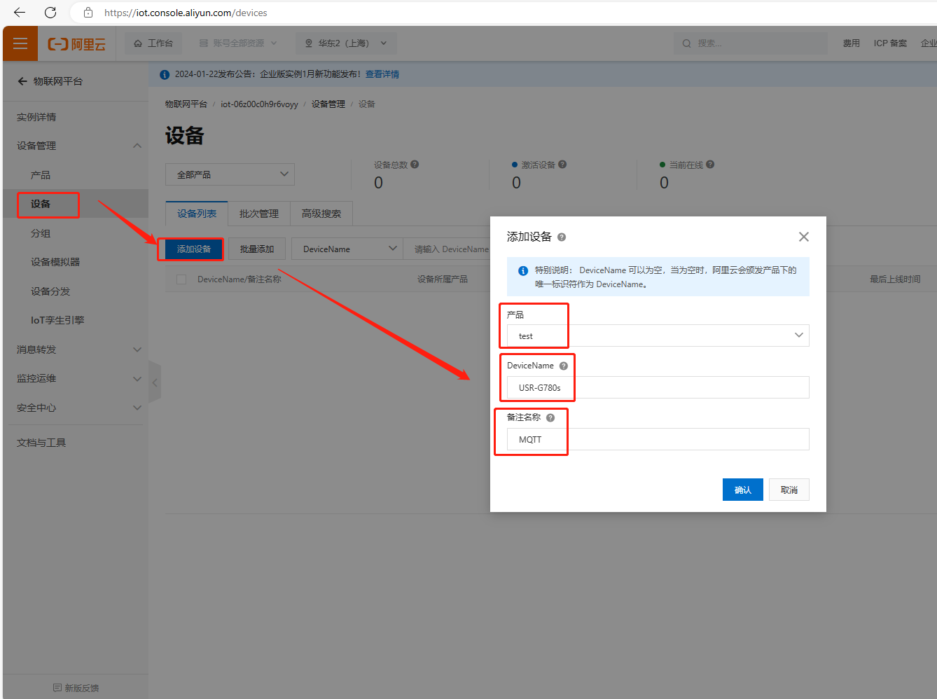 (1)產(chǎn)品創(chuàng)建成功后,添加設備。點擊設備,點擊添加設備,產(chǎn)品名舉例填test,DeviceName填USR-G780s,備注名稱填MQTT,點擊確認。