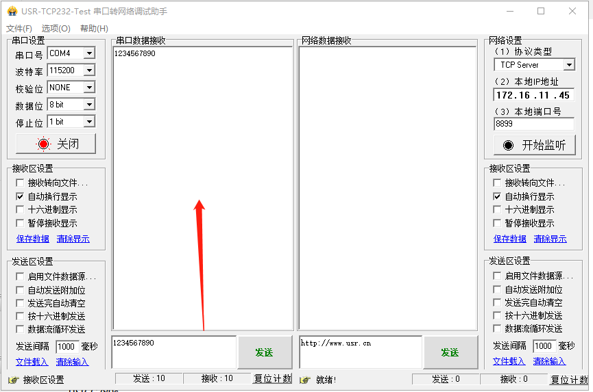 打開串口助手,串口參數(shù)和USR-G780s串口參數(shù)設置一致,發(fā)送1234567890給有人公司的測試服務器,測試服務器收到串口發(fā)送的數(shù)據(jù),會將數(shù)據(jù)返回給串口。因為開啟過濾HTTP頭功能,所以返回的信息中,只有數(shù)據(jù)1234567890。