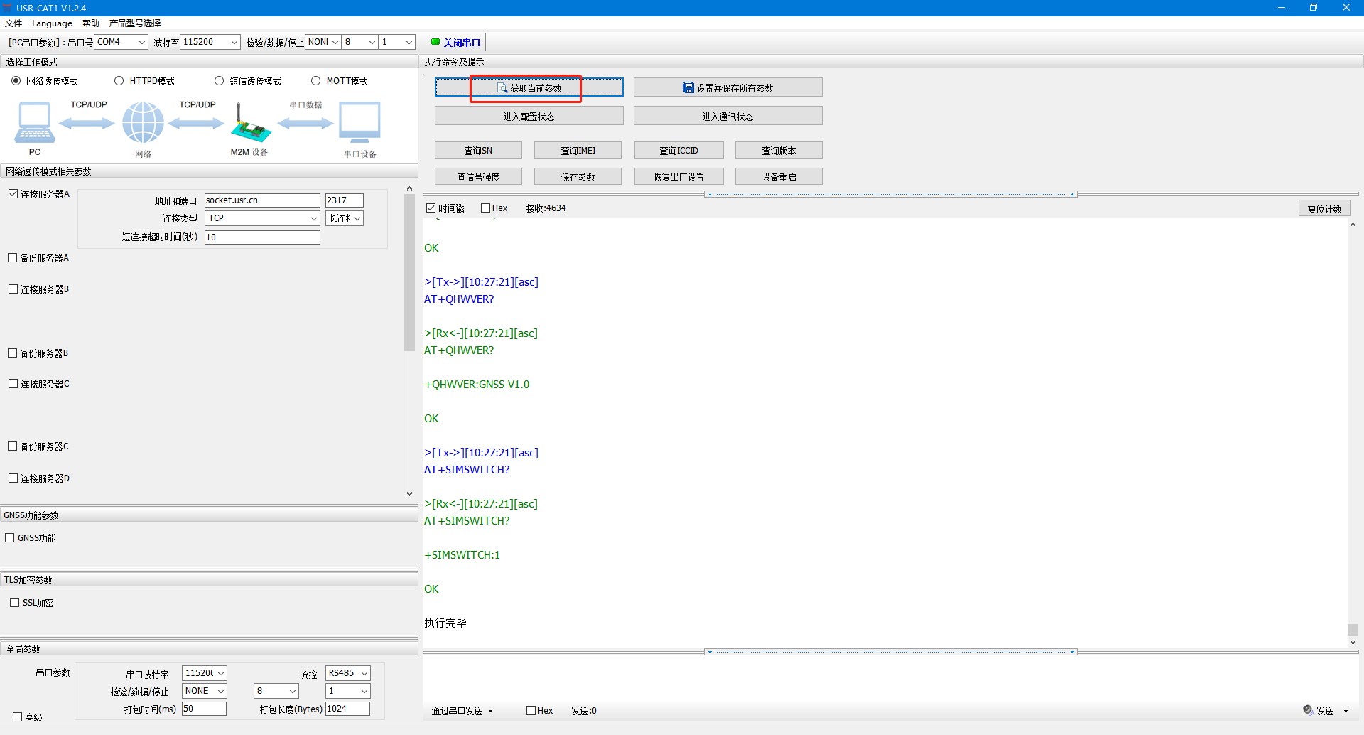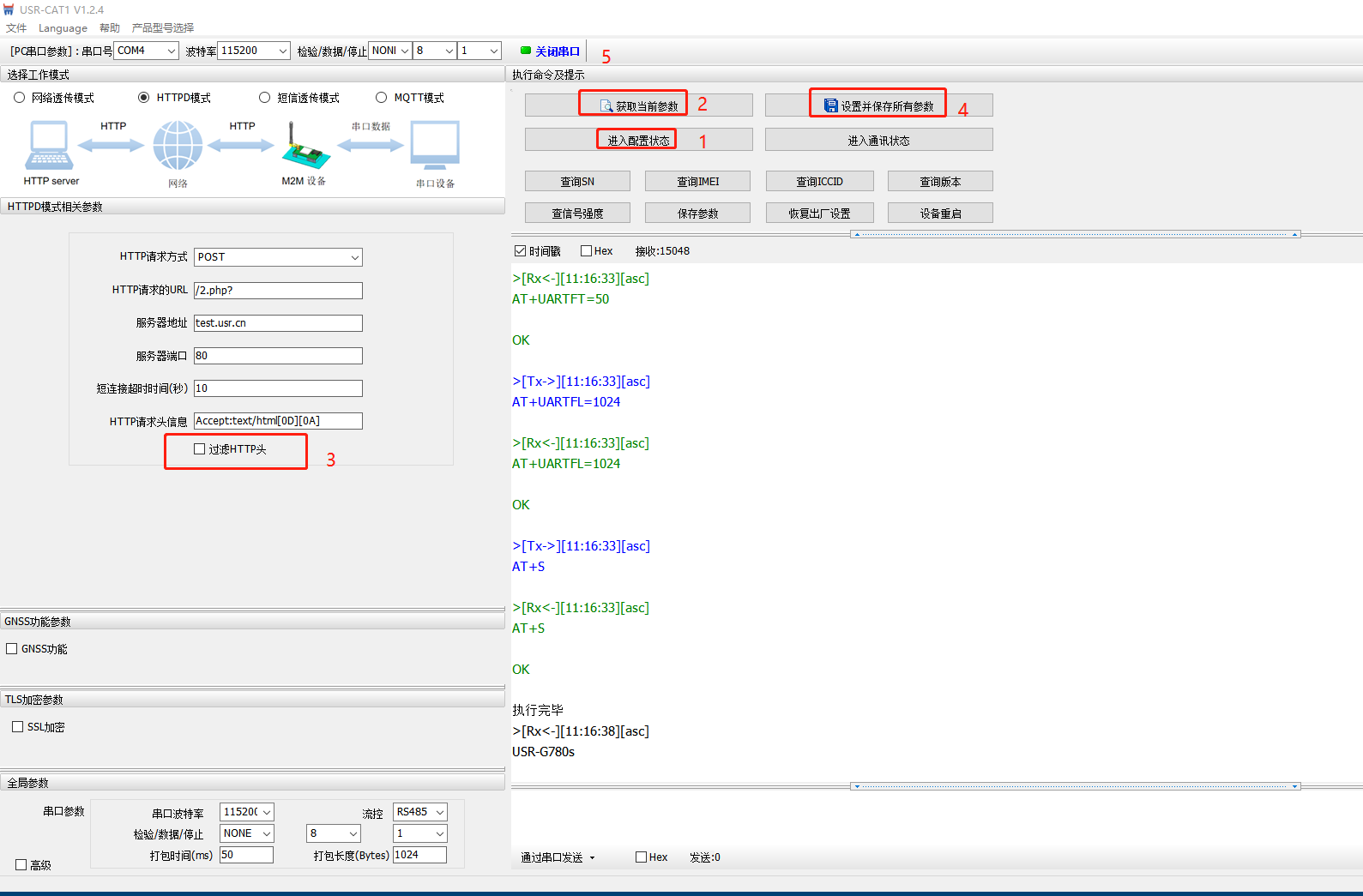 (1)關閉串口助手,打開USR-G780s的設置軟件,打開串口,點擊進入配置狀態(tài),點擊獲取當前參數(shù),取消勾選過濾HTTP頭功能,點擊設置并保存所有參數(shù)。參數(shù)設置成功之后,設置軟件關閉串口。