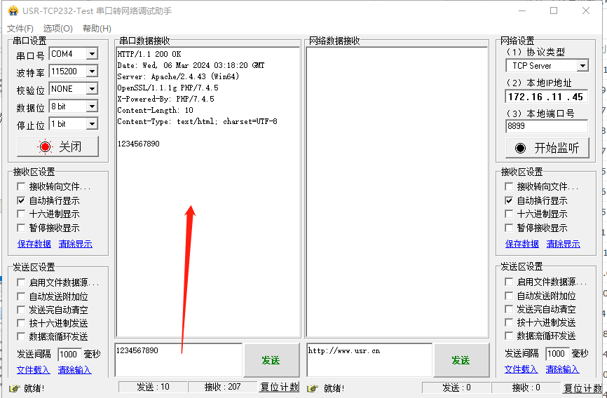 (2)打開串口助手,發(fā)送1234567890給有人公司的測試服務器,測試服務器收到串口發(fā)送的數(shù)據(jù),會將數(shù)據(jù)返回給串口。因為關閉過濾HTTP頭功能,所以返回的信息中,帶報頭信息和數(shù)據(jù)1234567890。