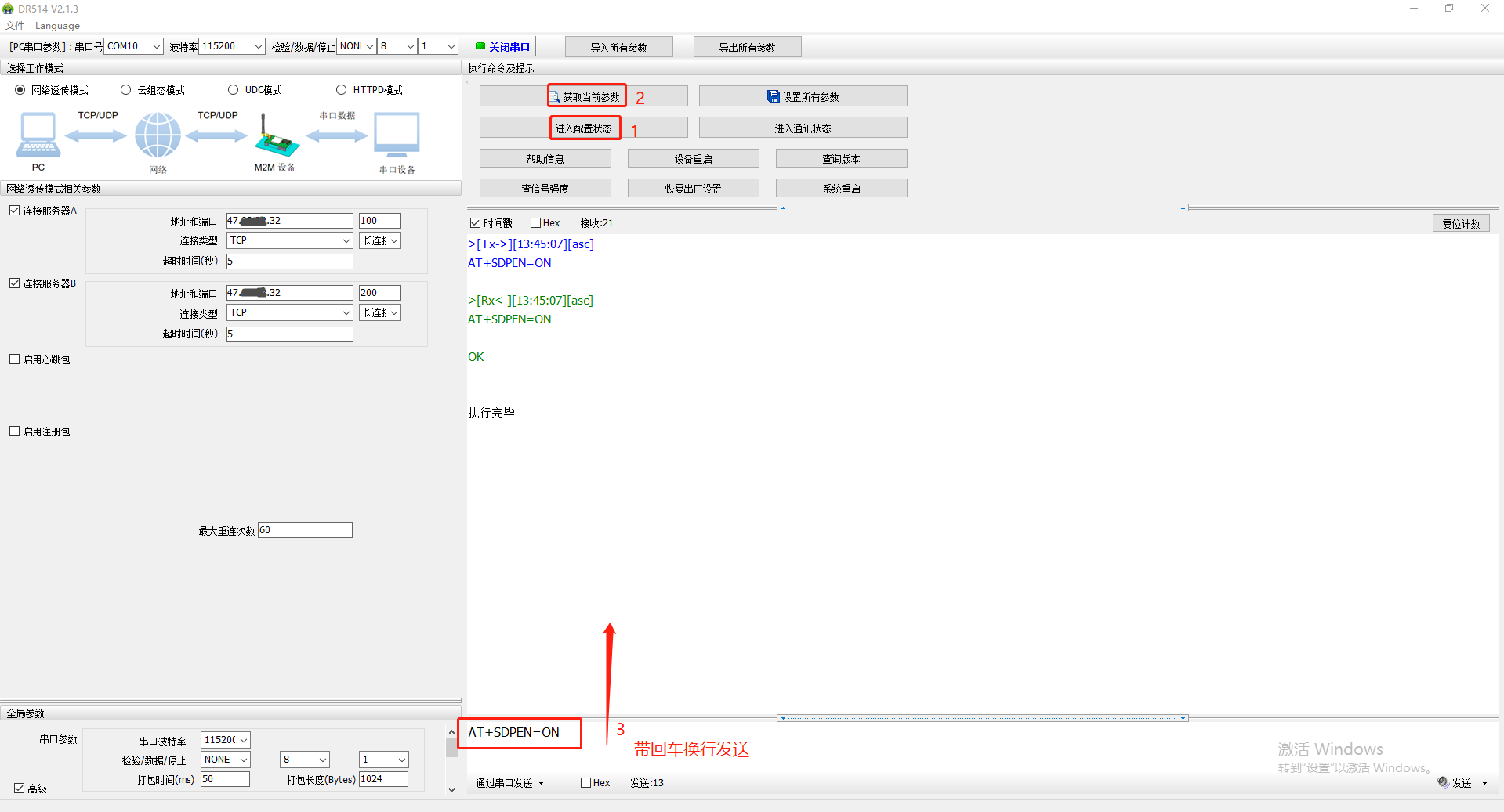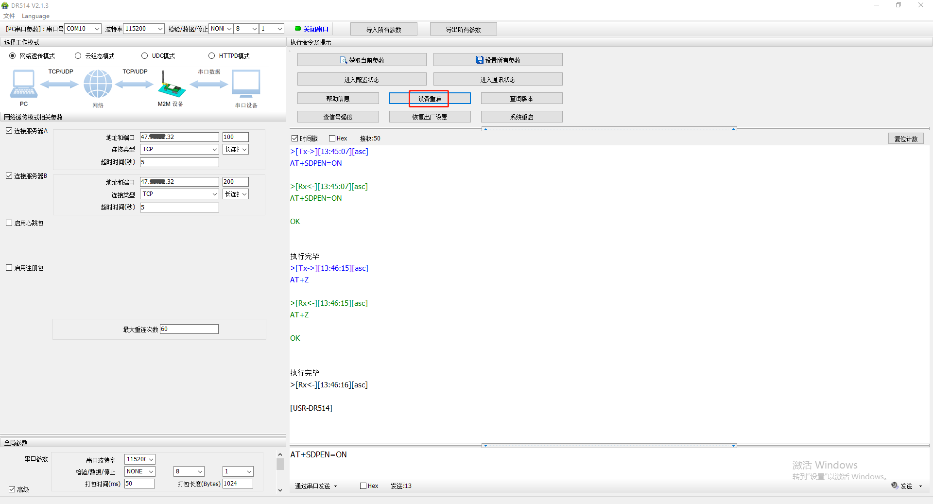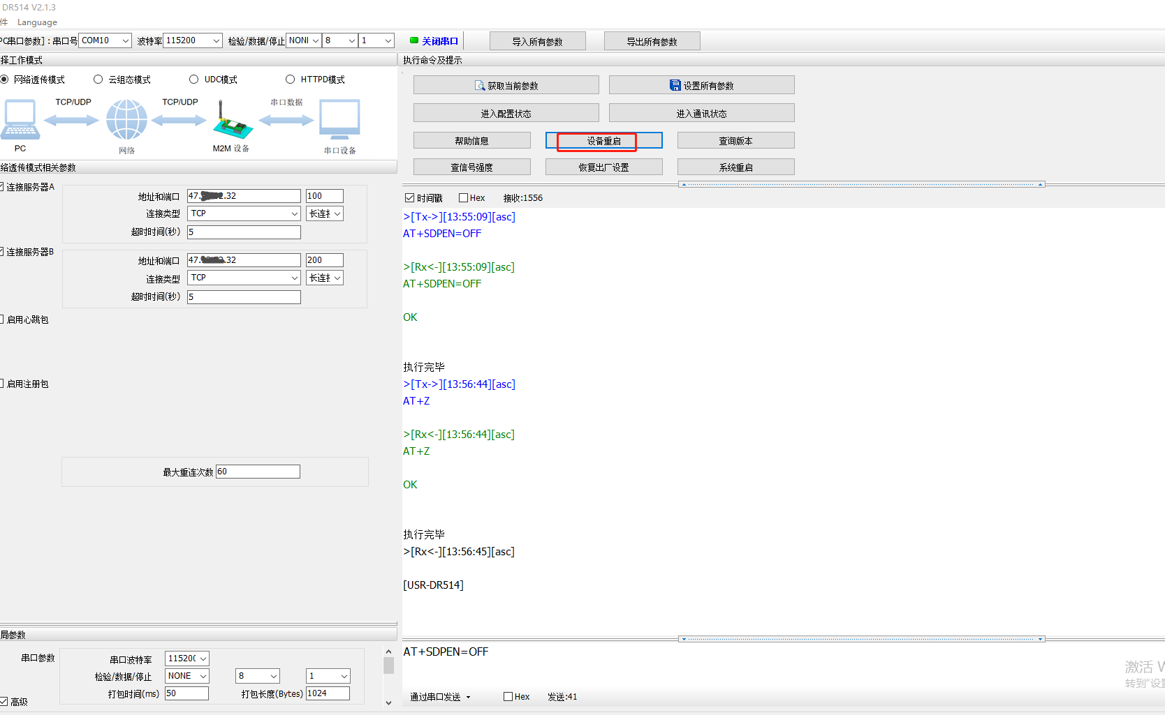 5、串口再次進(jìn)入配置狀態(tài),獲取當(dāng)前參數(shù),發(fā)送AT指令A(yù)T+SDPEN=ON開啟套接字分發(fā)功能,點(diǎn)擊設(shè)備重啟,保存參數(shù)設(shè)置。
