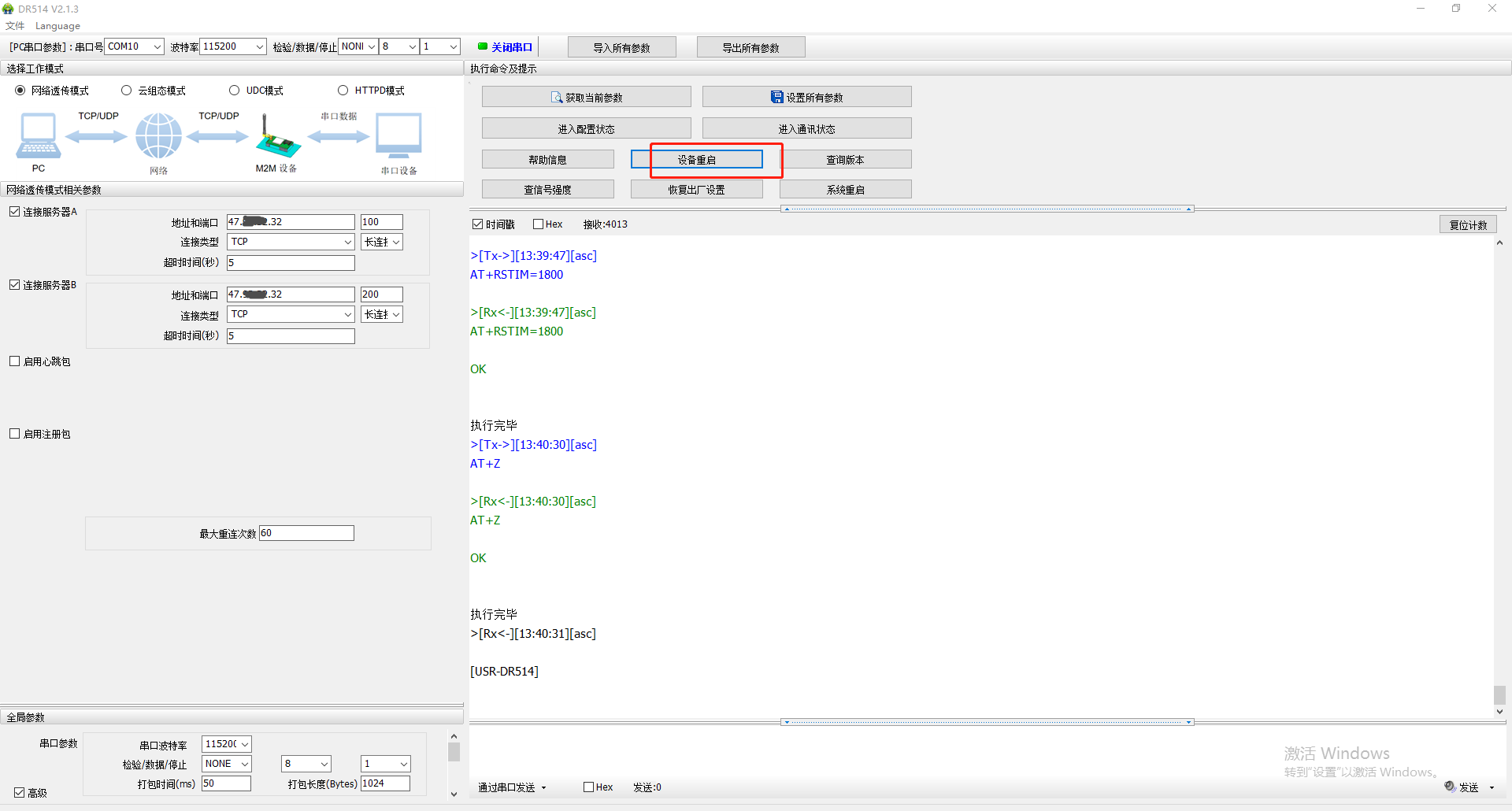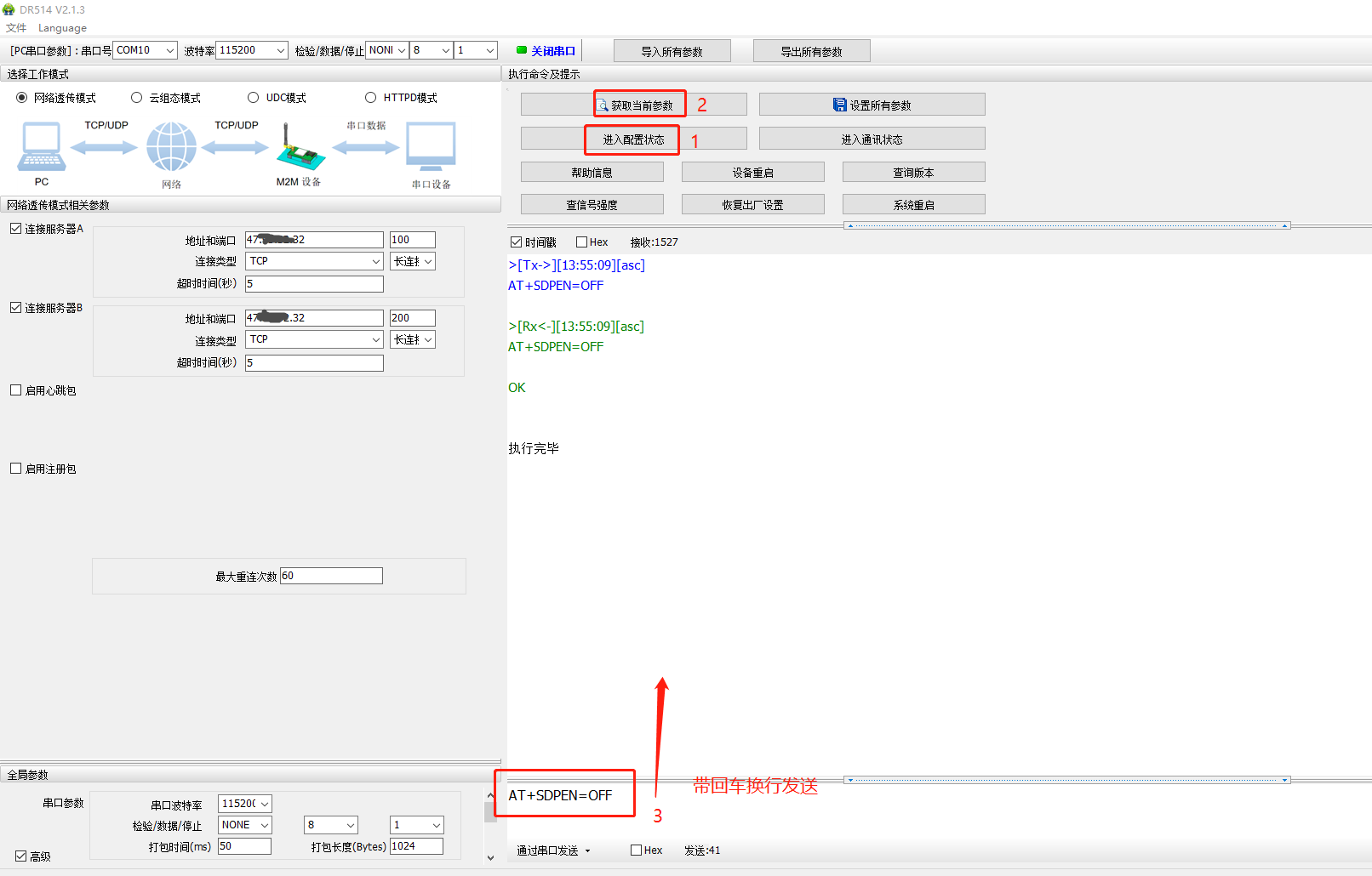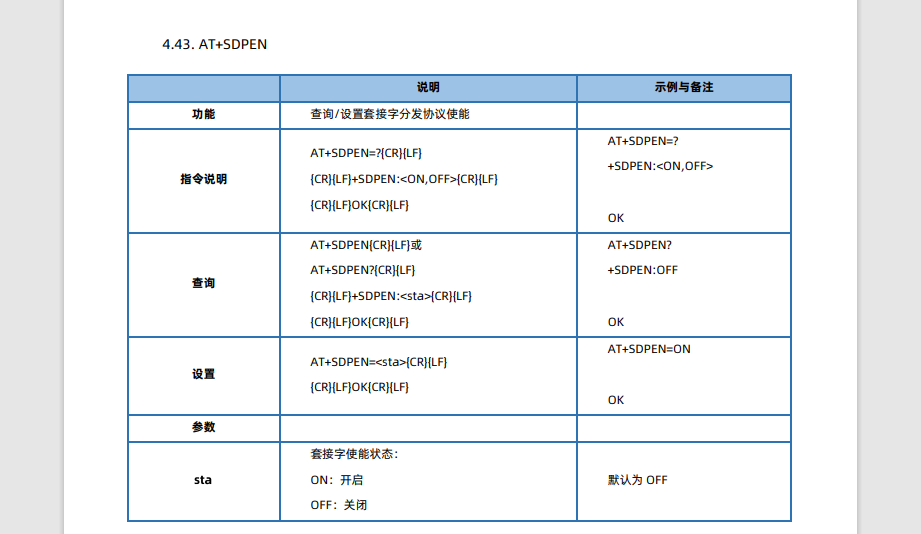 5、串口再次進(jìn)入配置狀態(tài),獲取當(dāng)前參數(shù),發(fā)送AT指令A(yù)T+SDPEN=ON開啟套接字分發(fā)功能,點(diǎn)擊設(shè)備重啟,保存參數(shù)設(shè)置。