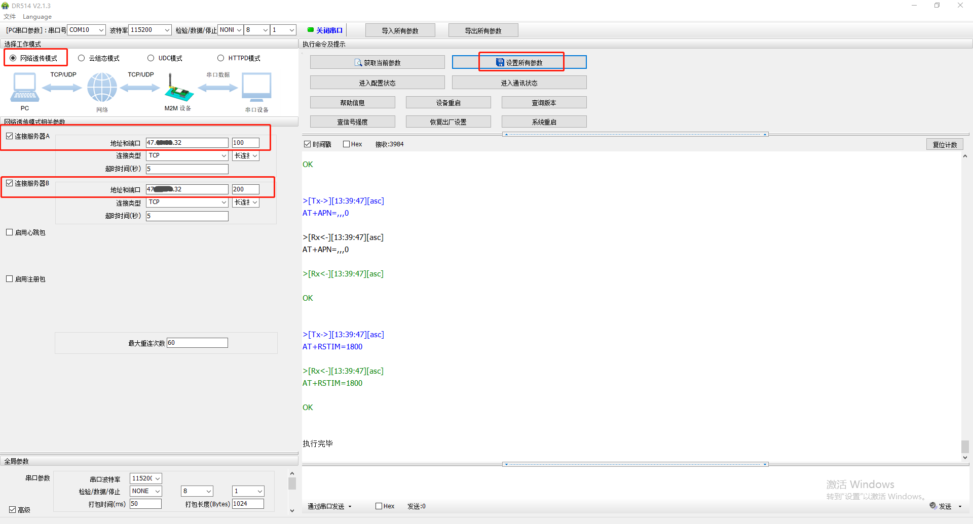 4、開啟2個服務(wù)器,設(shè)置服務(wù)器地址和端口參數(shù),點(diǎn)擊設(shè)置所有參數(shù)
