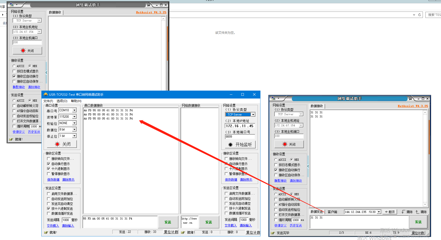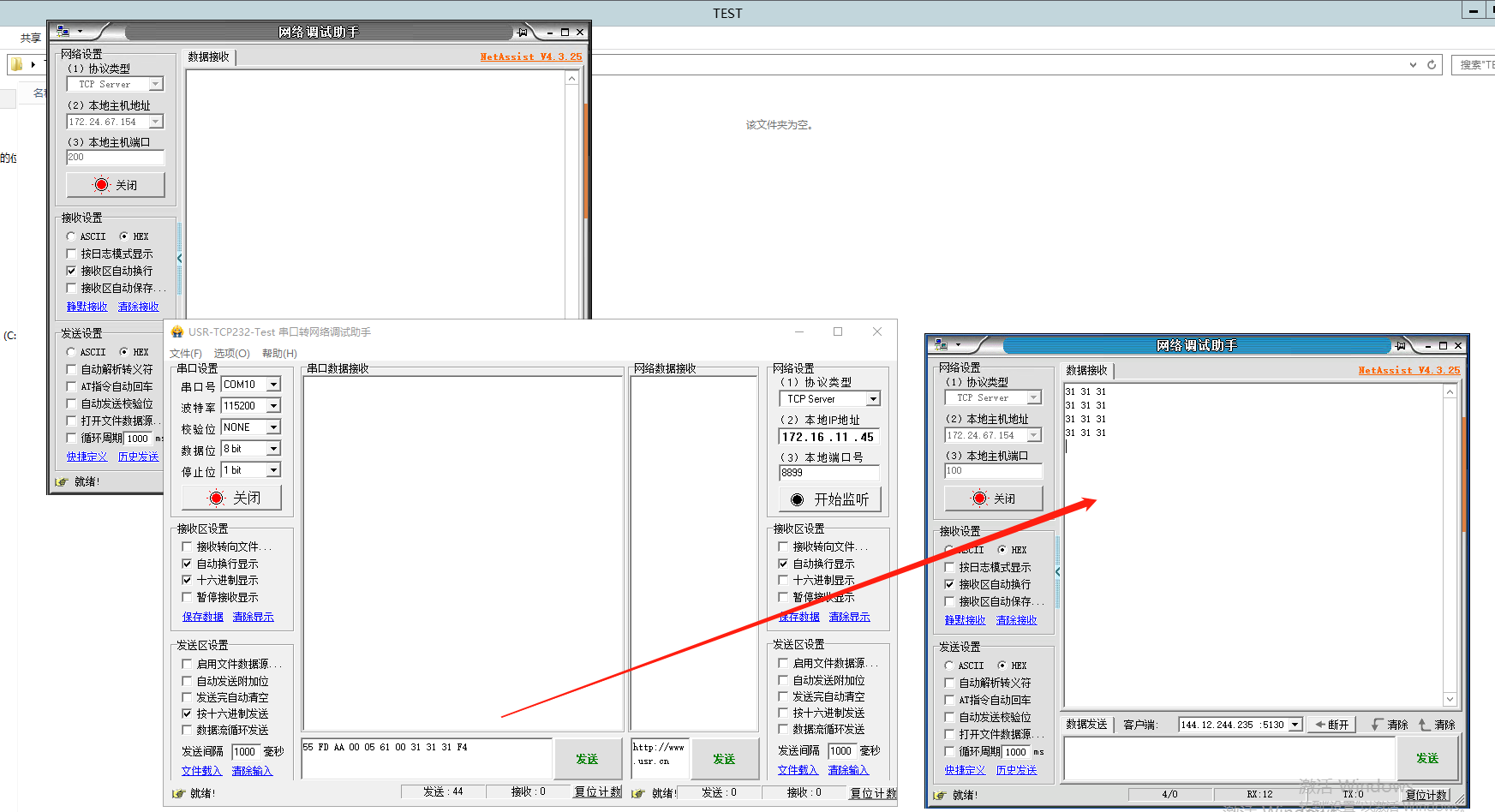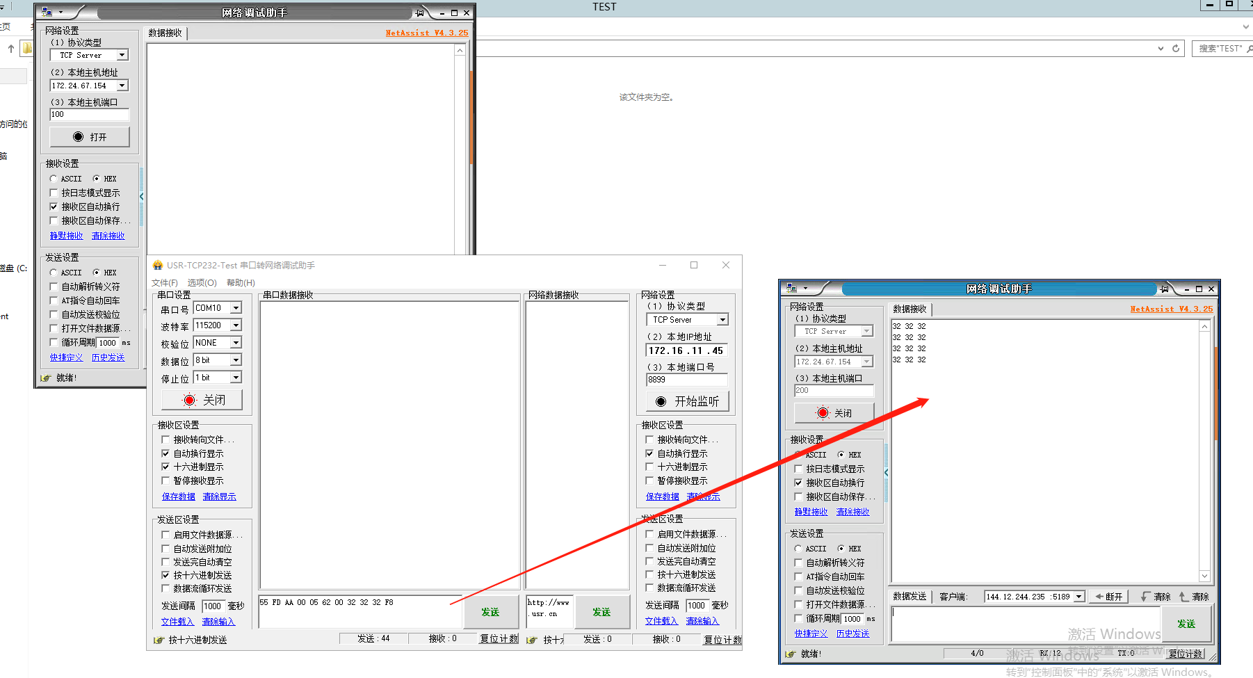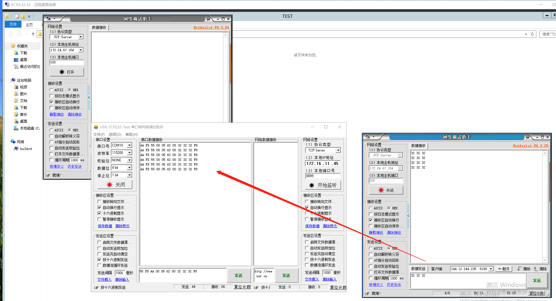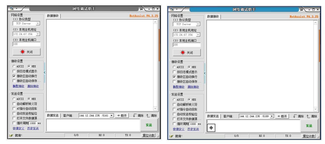 1、登錄遠(yuǎn)程服務(wù)器,打開2個網(wǎng)絡(luò)助手,分別使用2個端口100、200,點(diǎn)擊連接。USR-DR514會和2個網(wǎng)絡(luò)助手建立TCP連接。