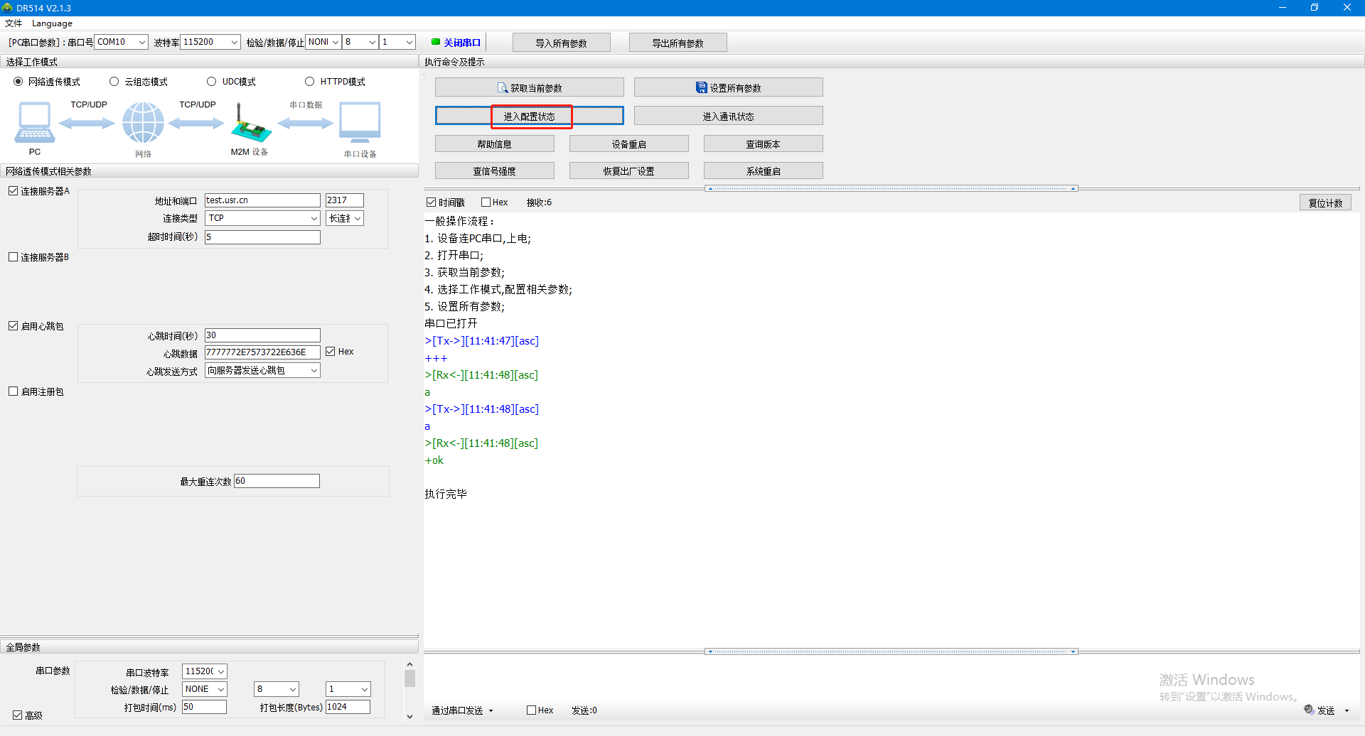 2、打開串口,點(diǎn)擊進(jìn)入配置狀態(tài)