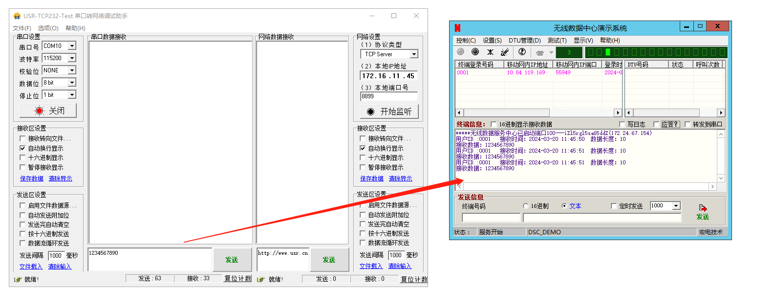 5、USR-DR514接USB-RS485到電腦,電腦打開(kāi)串口助手,打開(kāi)COM口,發(fā)送數(shù)據(jù)1234567890,遠(yuǎn)程服務(wù)器上的無(wú)線數(shù)據(jù)中心演示系統(tǒng)顯示接收信息。