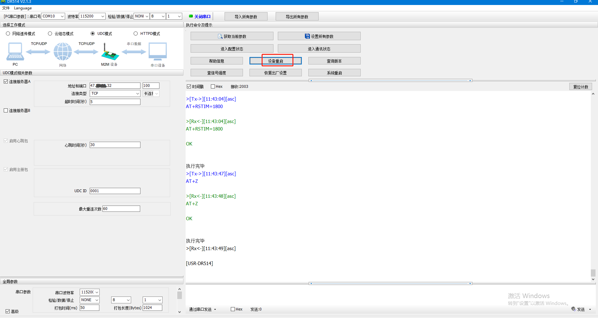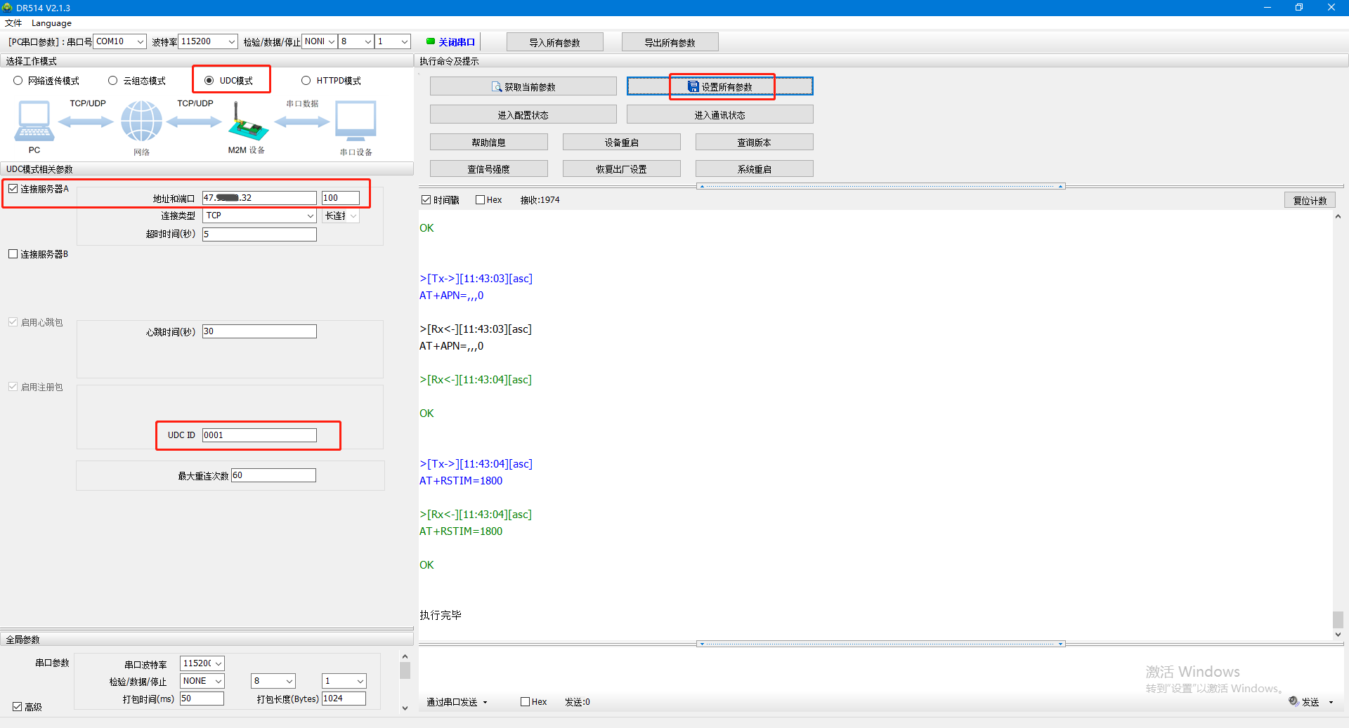 4、選擇UDC模式,勾選連接服務(wù)器A,地址設(shè)置要連接的遠(yuǎn)程服務(wù)器地址,端口100,連接類(lèi)型TCP,長(zhǎng)連接。UDC ID用0001。設(shè)置完參數(shù),點(diǎn)擊設(shè)置所有參數(shù),點(diǎn)擊設(shè)備重啟。
