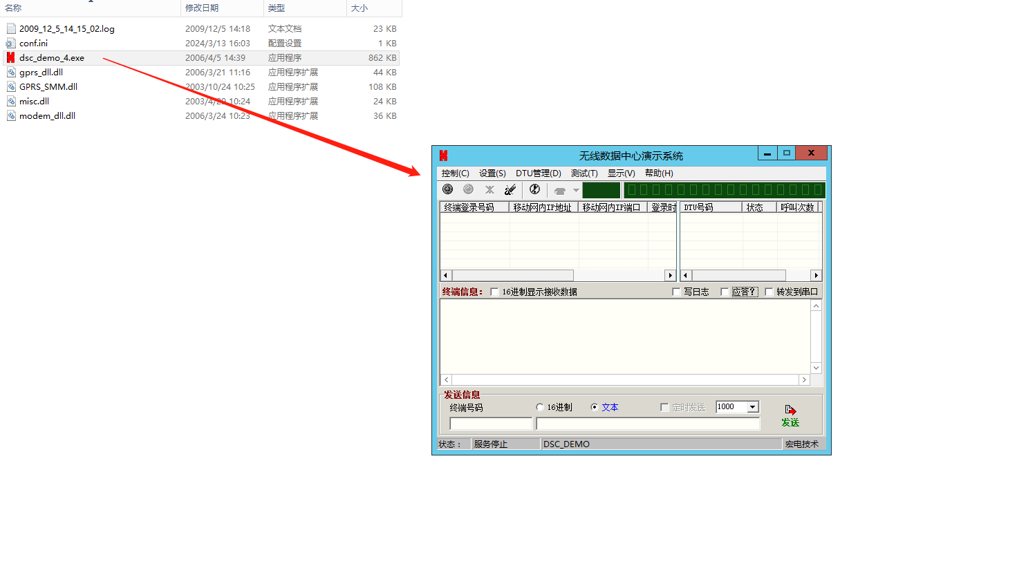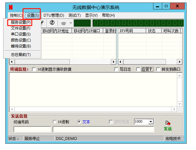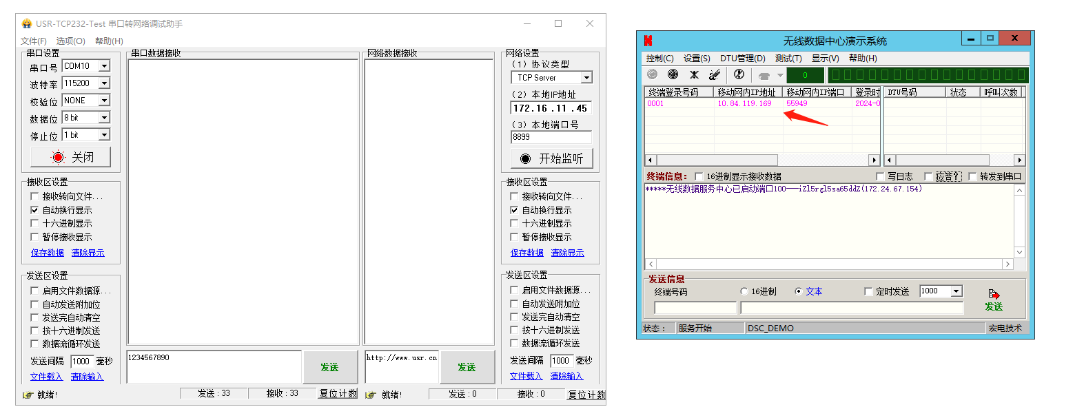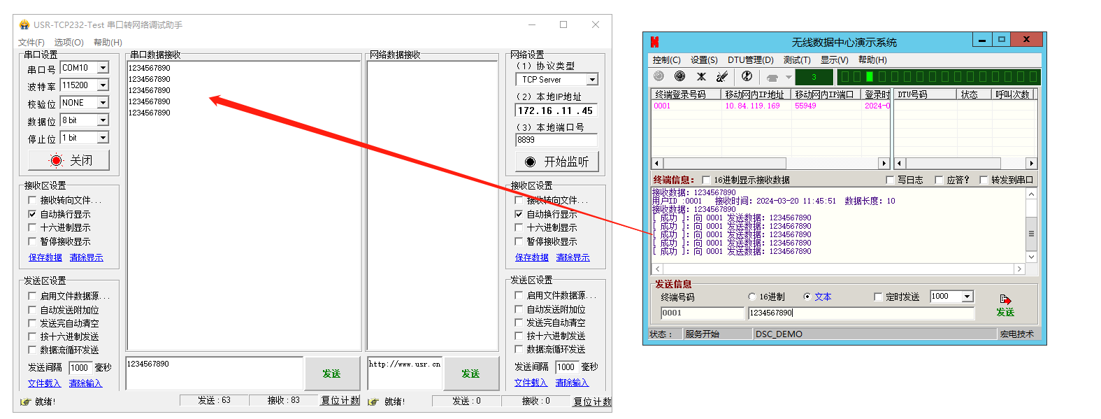 6、無(wú)線數(shù)據(jù)中心演示系統(tǒng)發(fā)送信息區(qū),對(duì)終端號(hào)碼0001,發(fā)送1234567890,USR-DR514連接的串口助手,接收到數(shù)據(jù)1234567890。