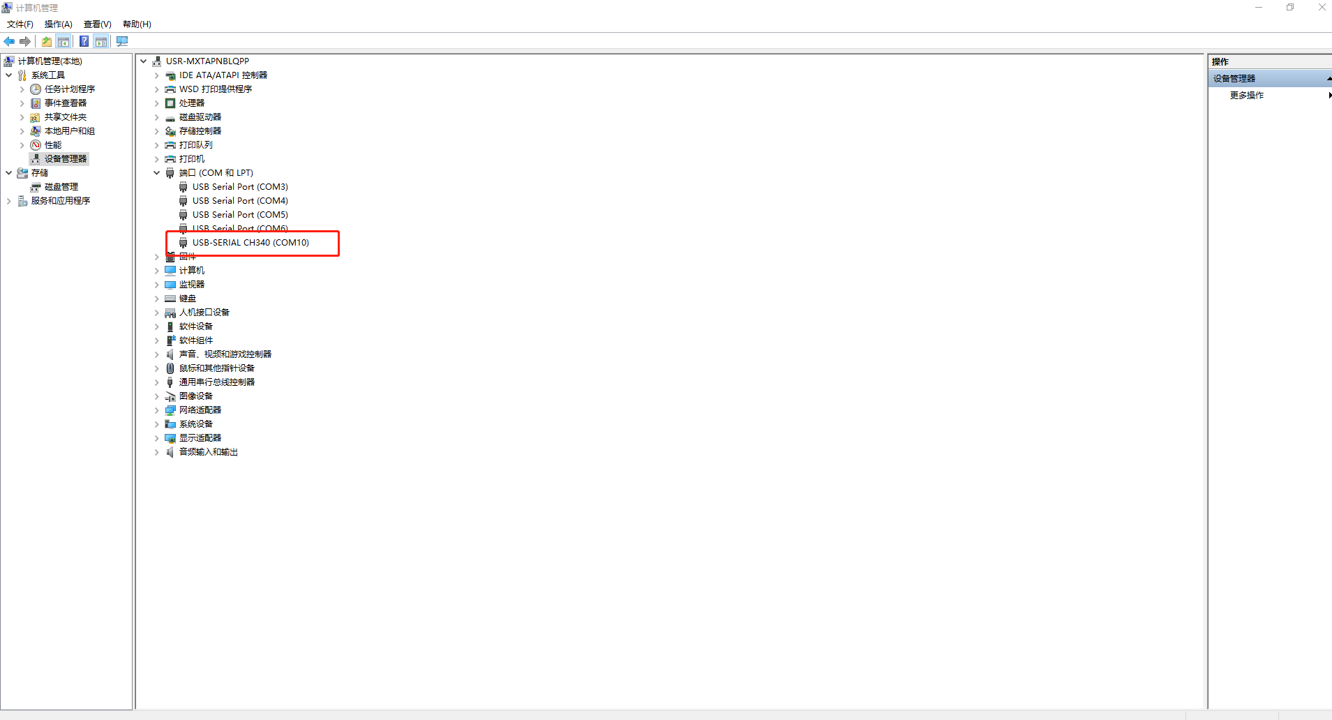 電腦鼠標(biāo)點(diǎn)擊計(jì)算機(jī)管理,右擊,點(diǎn)開(kāi)設(shè)備管理器,點(diǎn)擊端口,查看接USR-DR514的USB-RS485串口線COM口號(hào),COM10。