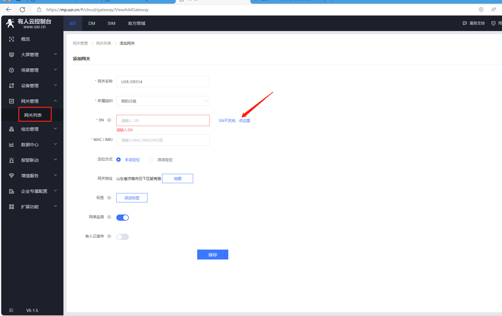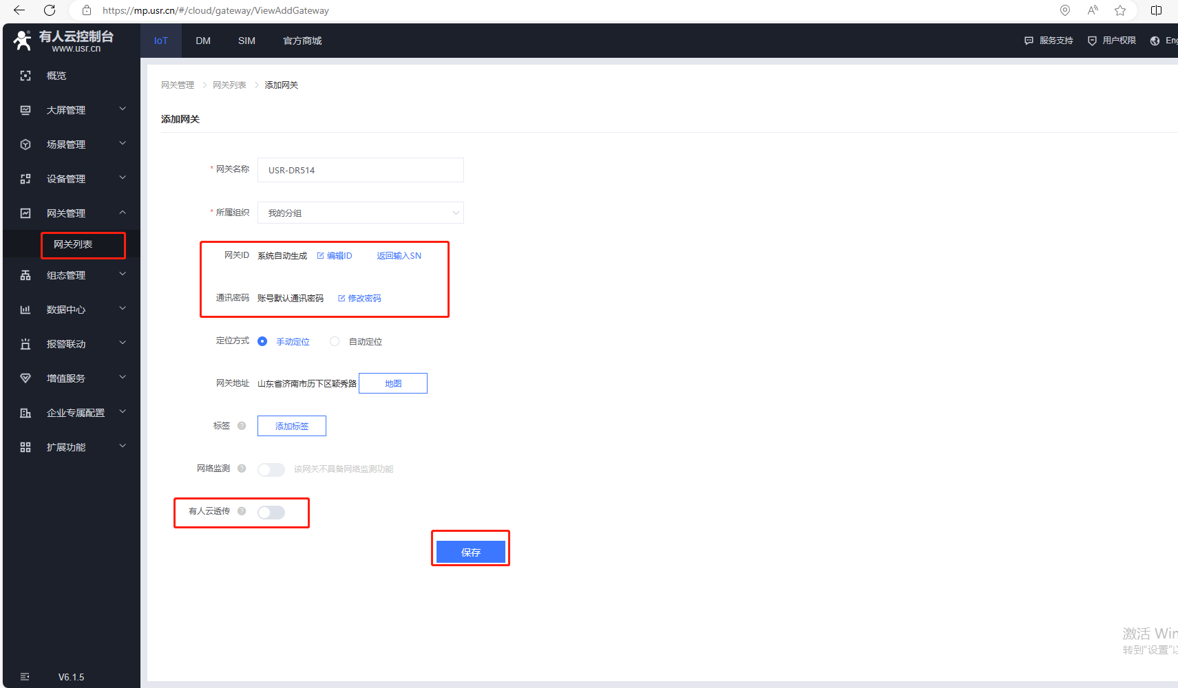 (2)USR-DR514不支持SN上云,就點擊SN不支持,點這里,用自動生成的ID方式上云,在有人云上添加設備,用云端輪詢時有人云透傳需要關(guān)閉,最后點擊保存。