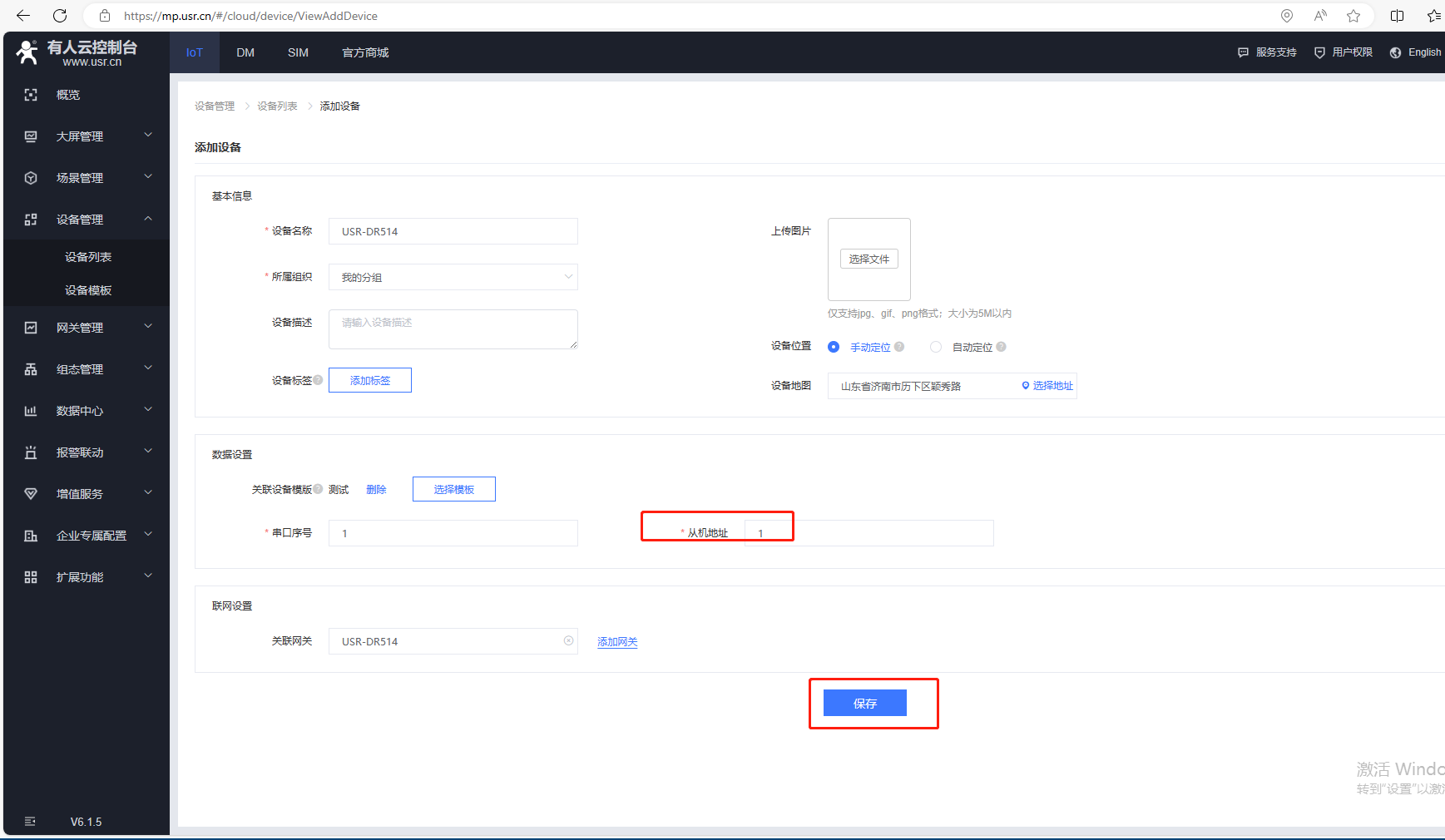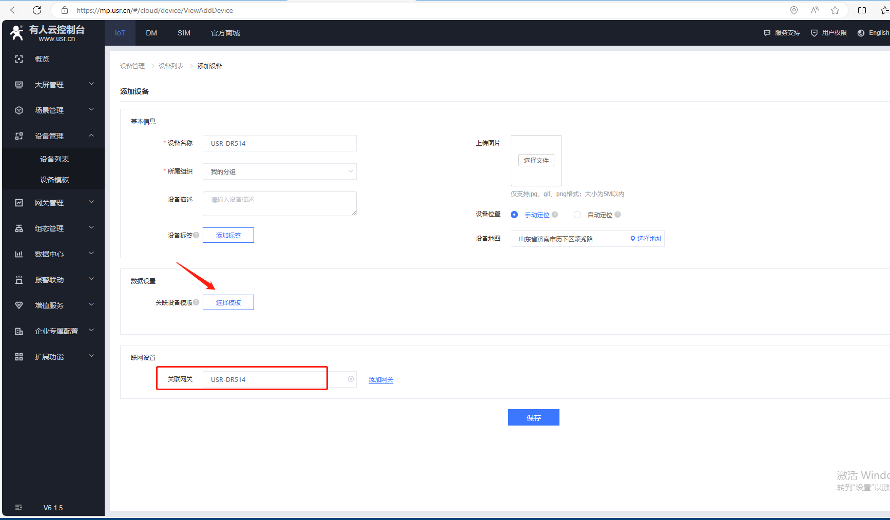 聯(lián)網(wǎng)設置,關(guān)聯(lián)網(wǎng)關(guān)選擇自身設備,USR-DR514,最后點擊保存。