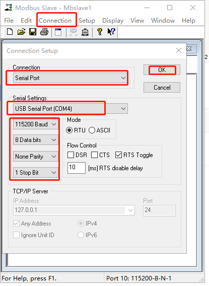 (2)點擊Connection,選擇串口,對應USR-DR514所接USB-RS485串口線的COM口號,串口參數(shù)和USR-DR514串口參數(shù)保持一致。 Mode選擇RTU,模擬MODBUS RTU協(xié)議串口。