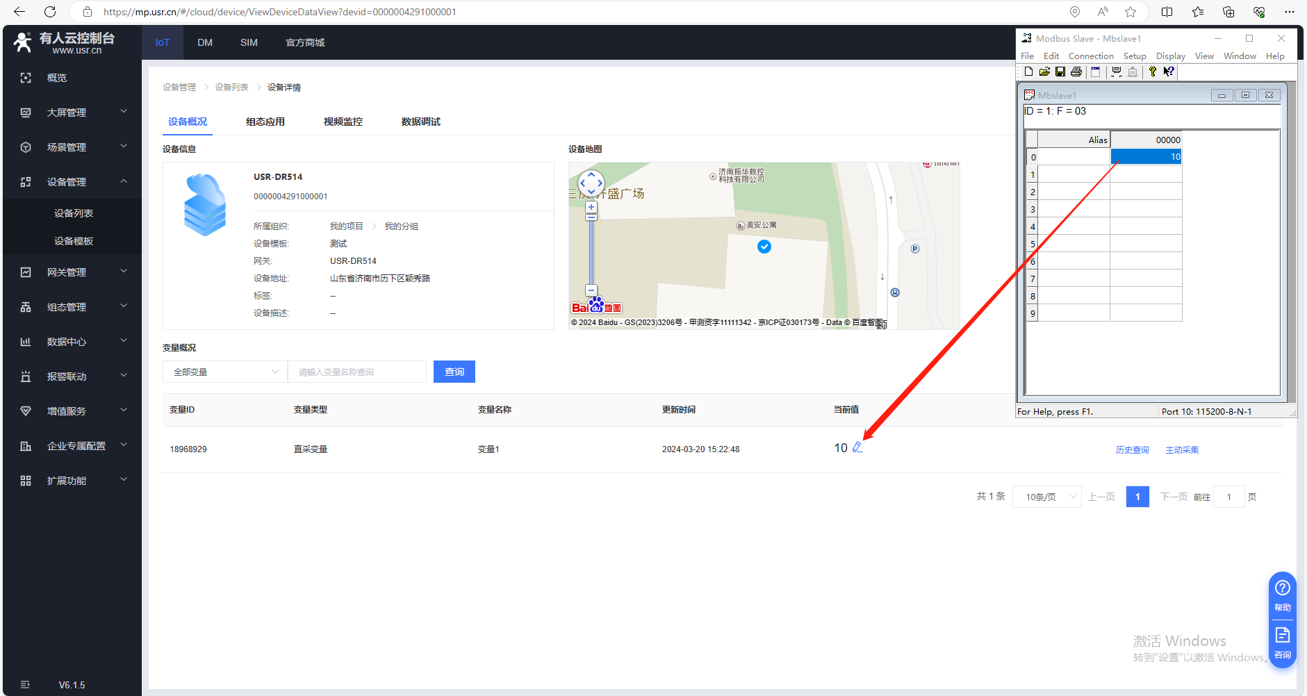 2、MODBUS slave數(shù)據(jù)設置10,有人云設備列表1分鐘采集,可以看到變量采集的當前值數(shù)據(jù)10。