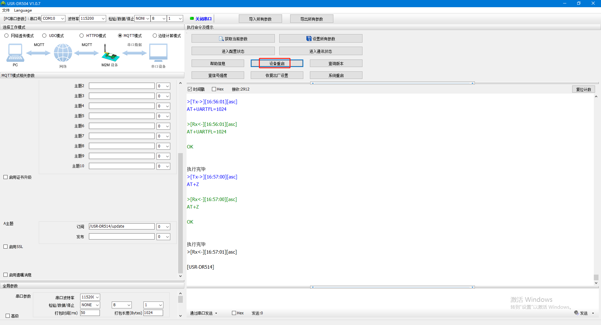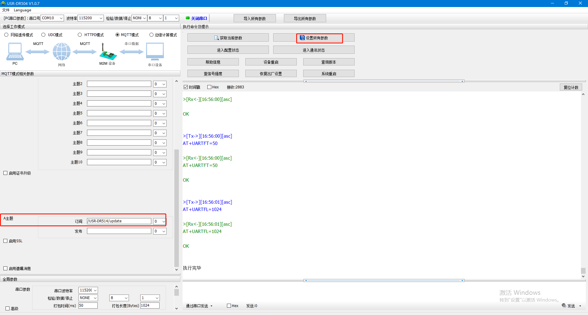 (8)A主題:發(fā)布主題,填寫/USR-DR514/update,設(shè)置軟件點擊設(shè)置所有參數(shù),